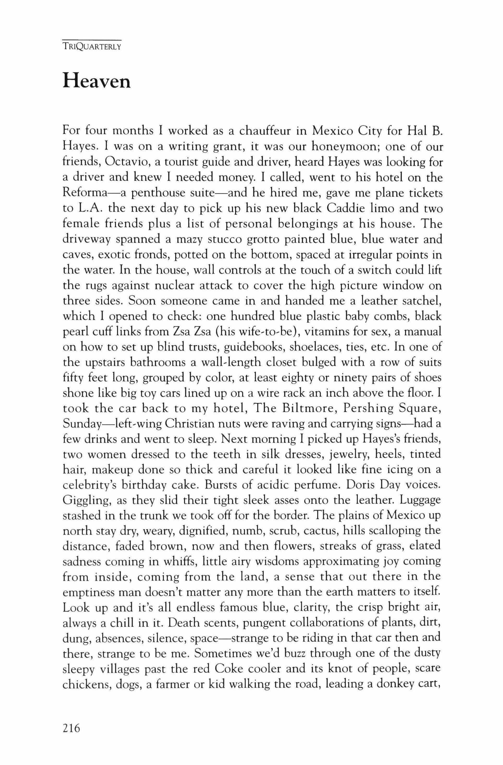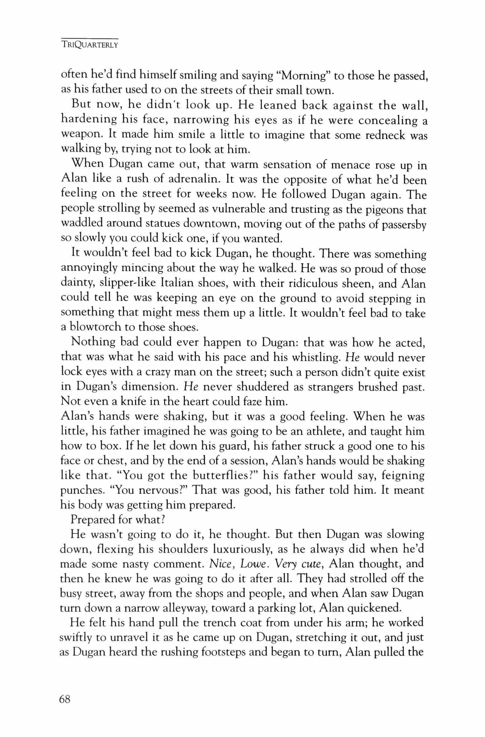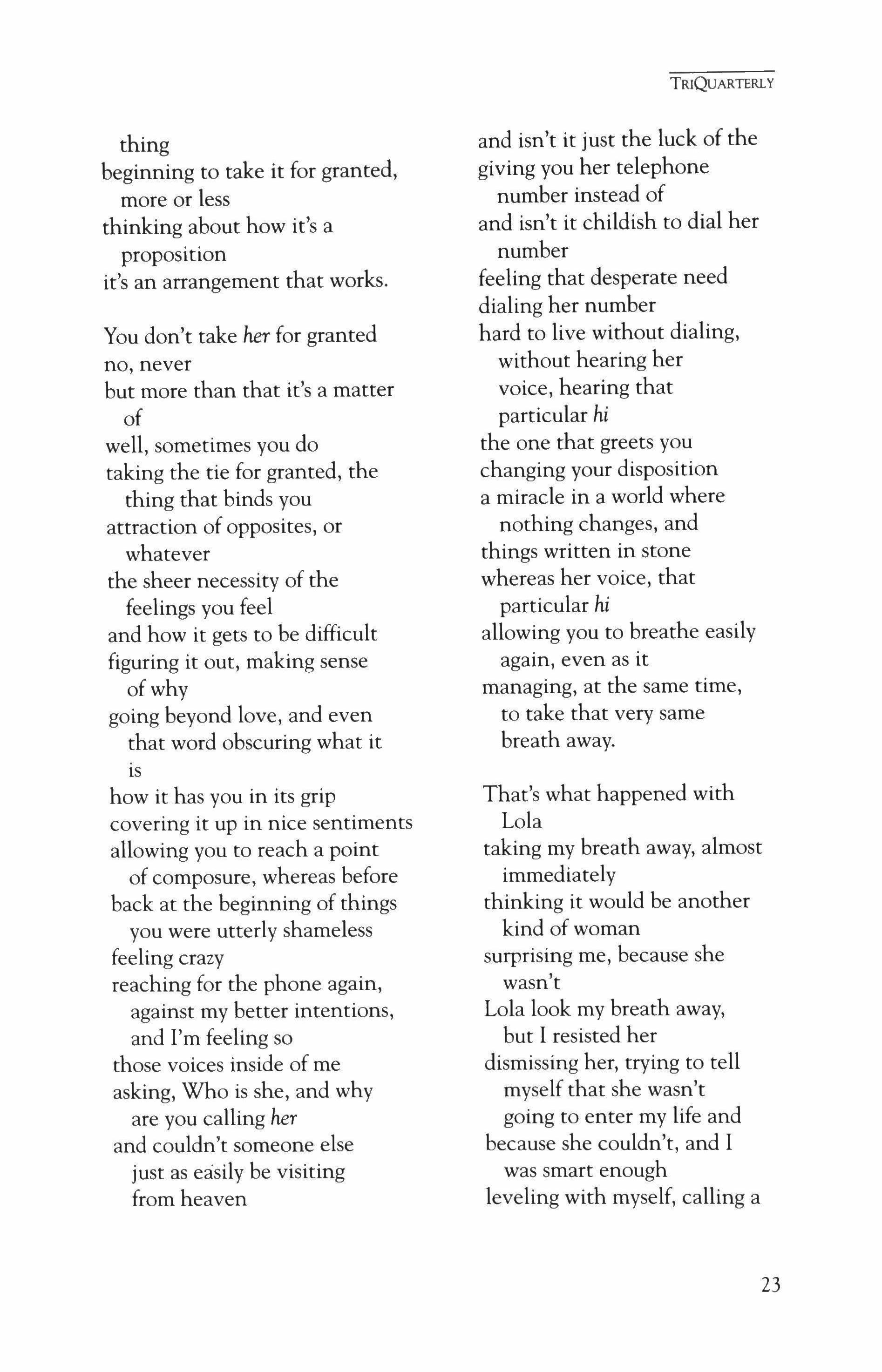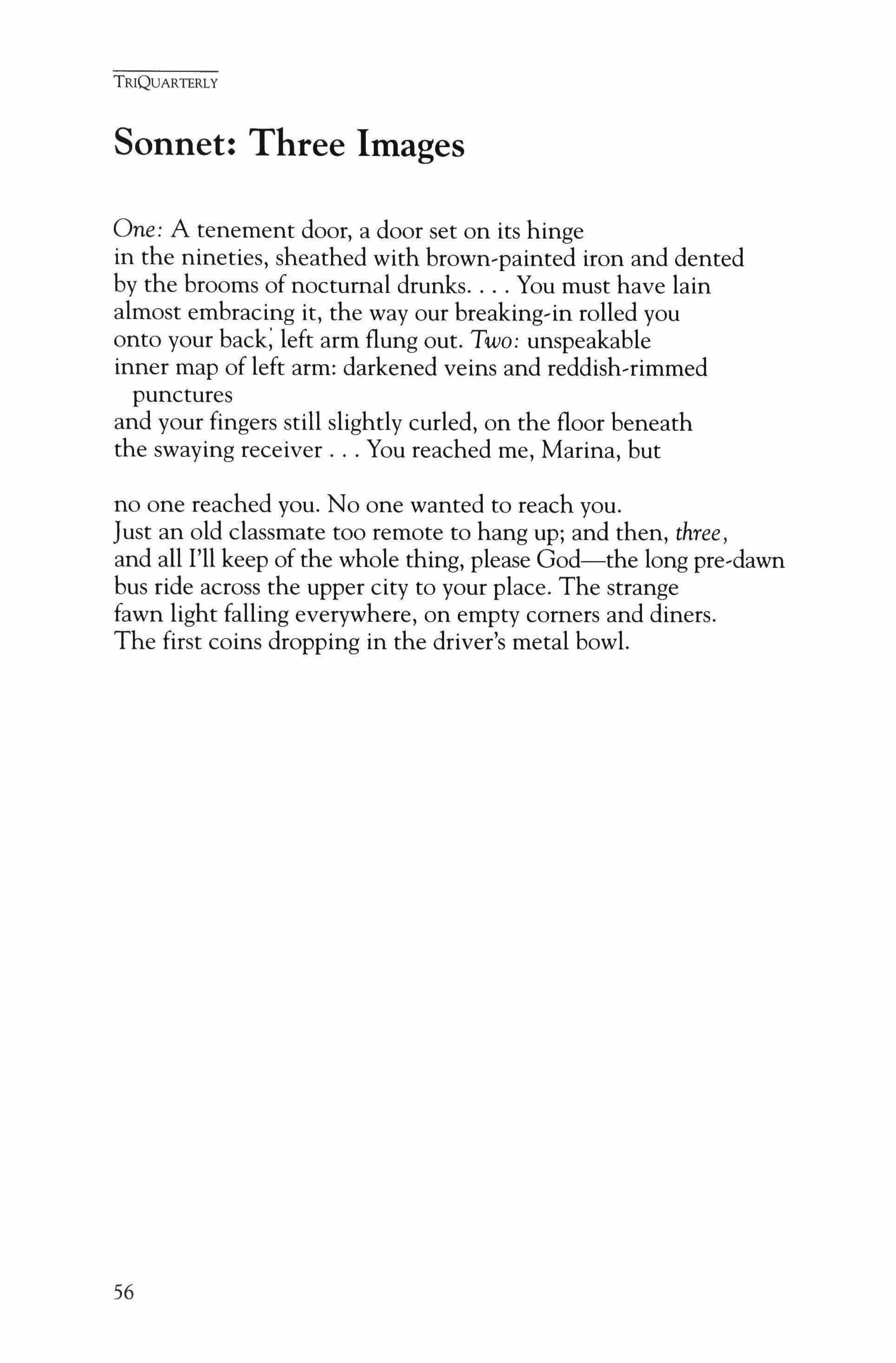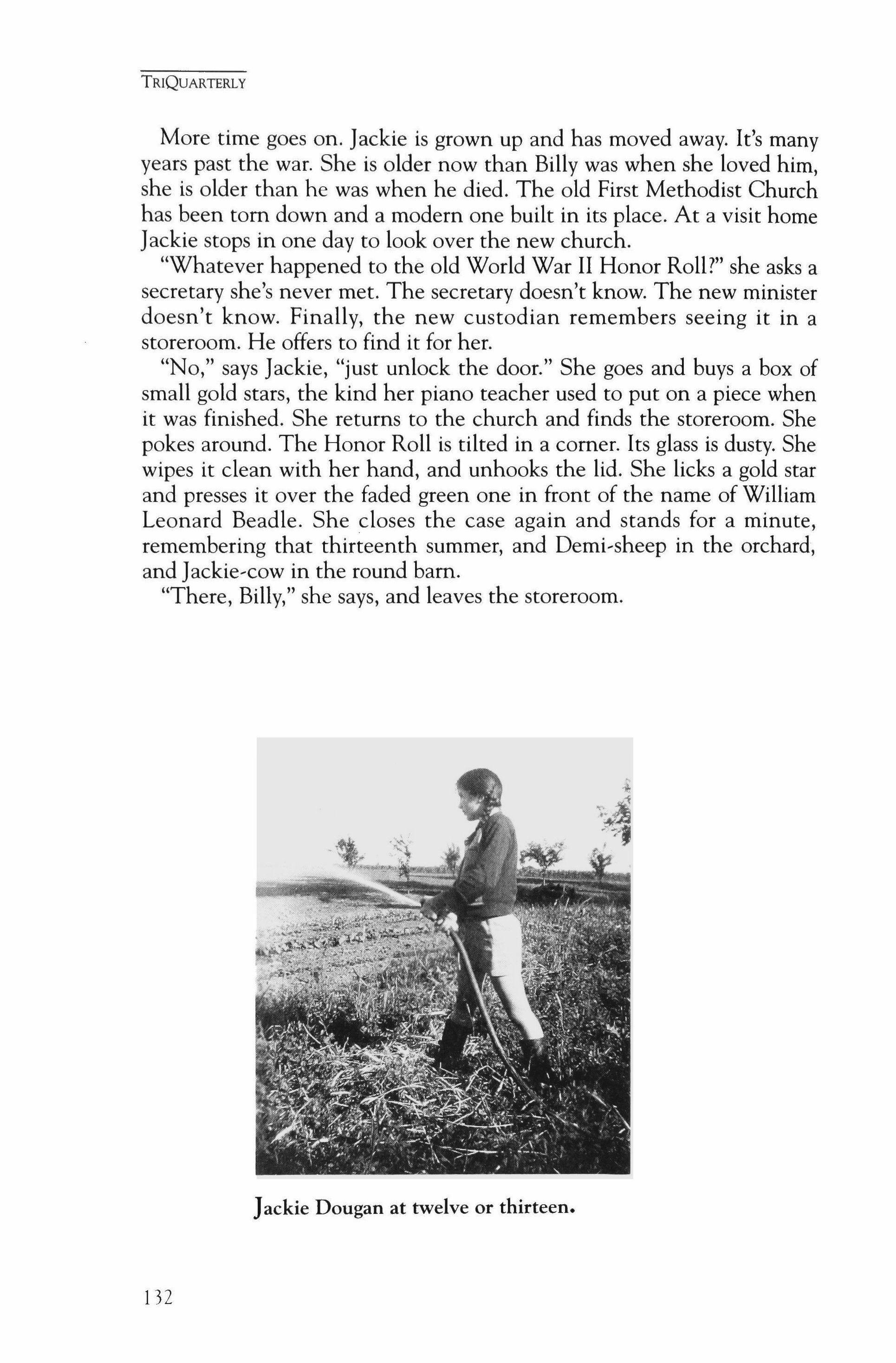 Publication of TriQuarterly is made possible in part by the donors of gifts and grants to the magazine. For their recent and continuing support, we are very pleased to thank the Illinois Arts Council, the Lannan Foundation, the John D. and Catherine T. MacArthur Foundation, the National Endowment for the Arts, the Sara Lee Foundation, the Wendling Foundation, and individual donors. Major new marketing initiatives at TriQuarterly have been made possible by the Lila Wallace,Reader's Digest Literary Publishers Marketing Development Program, funded through a grant to the Council of Literary Magazines and Presses.