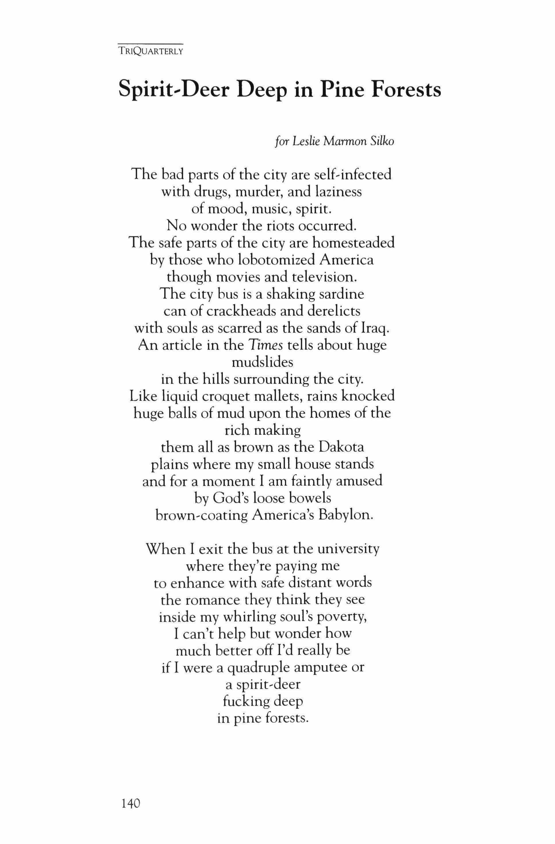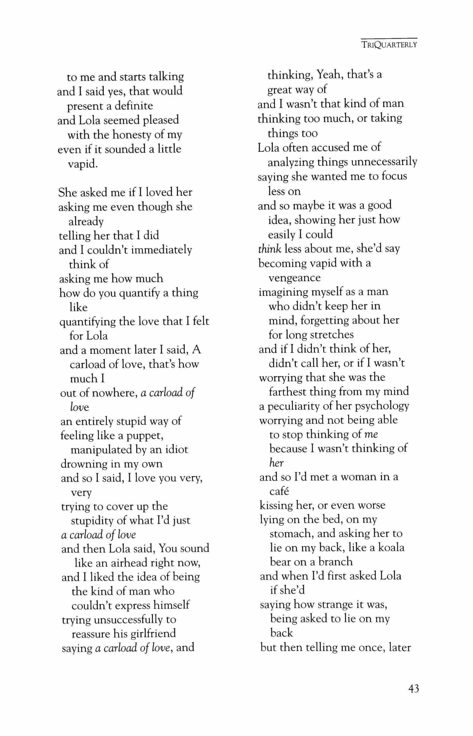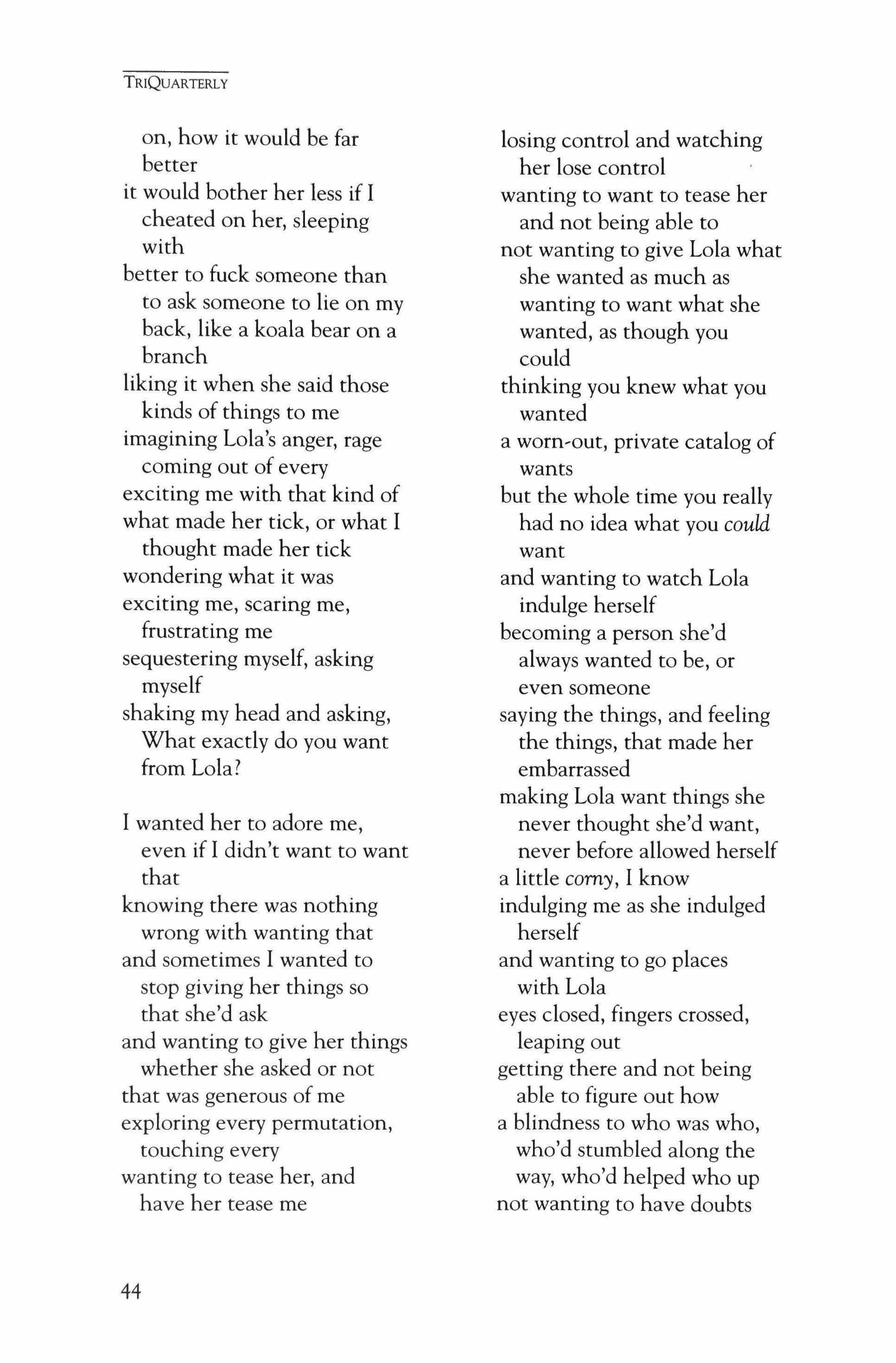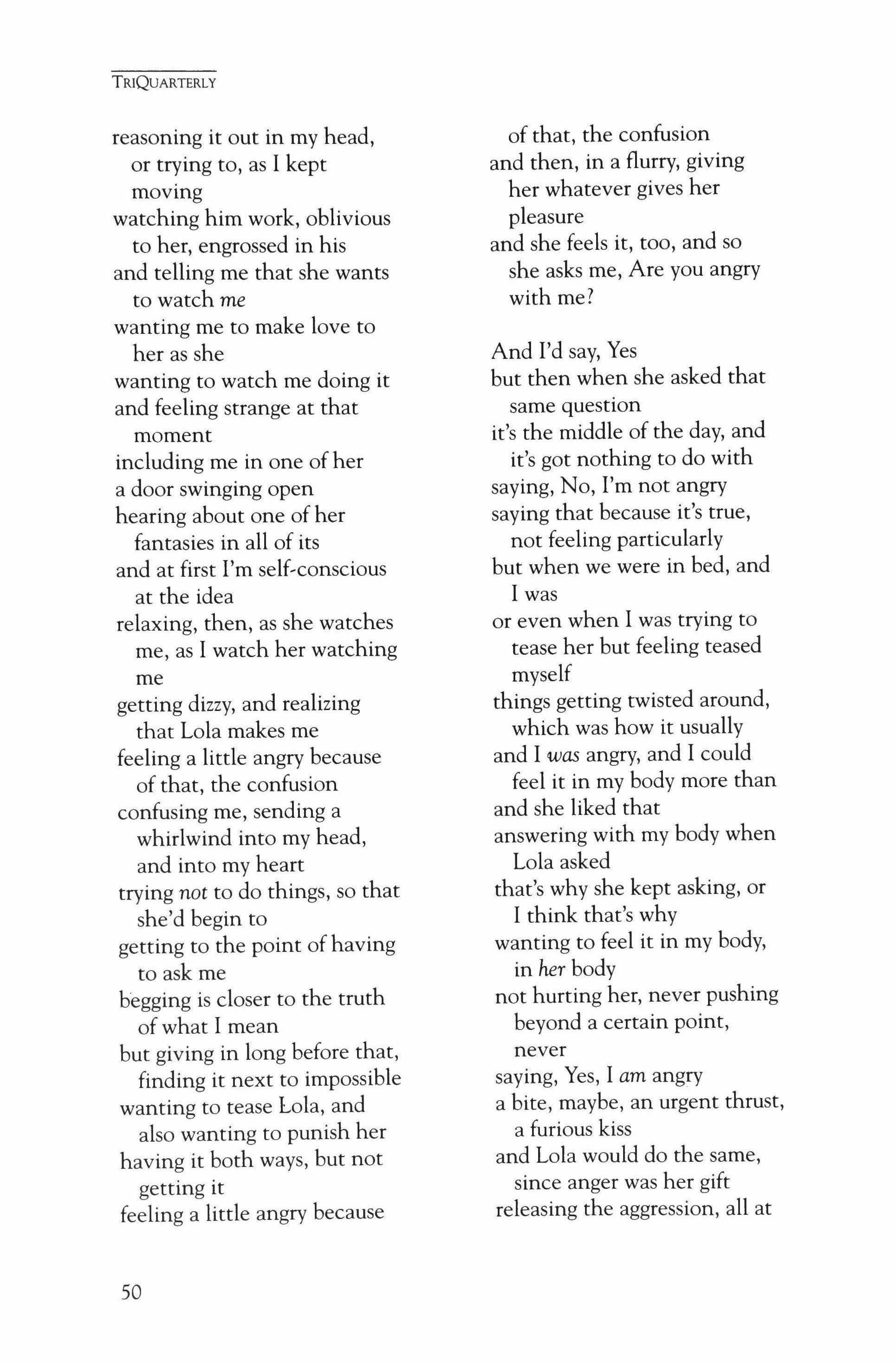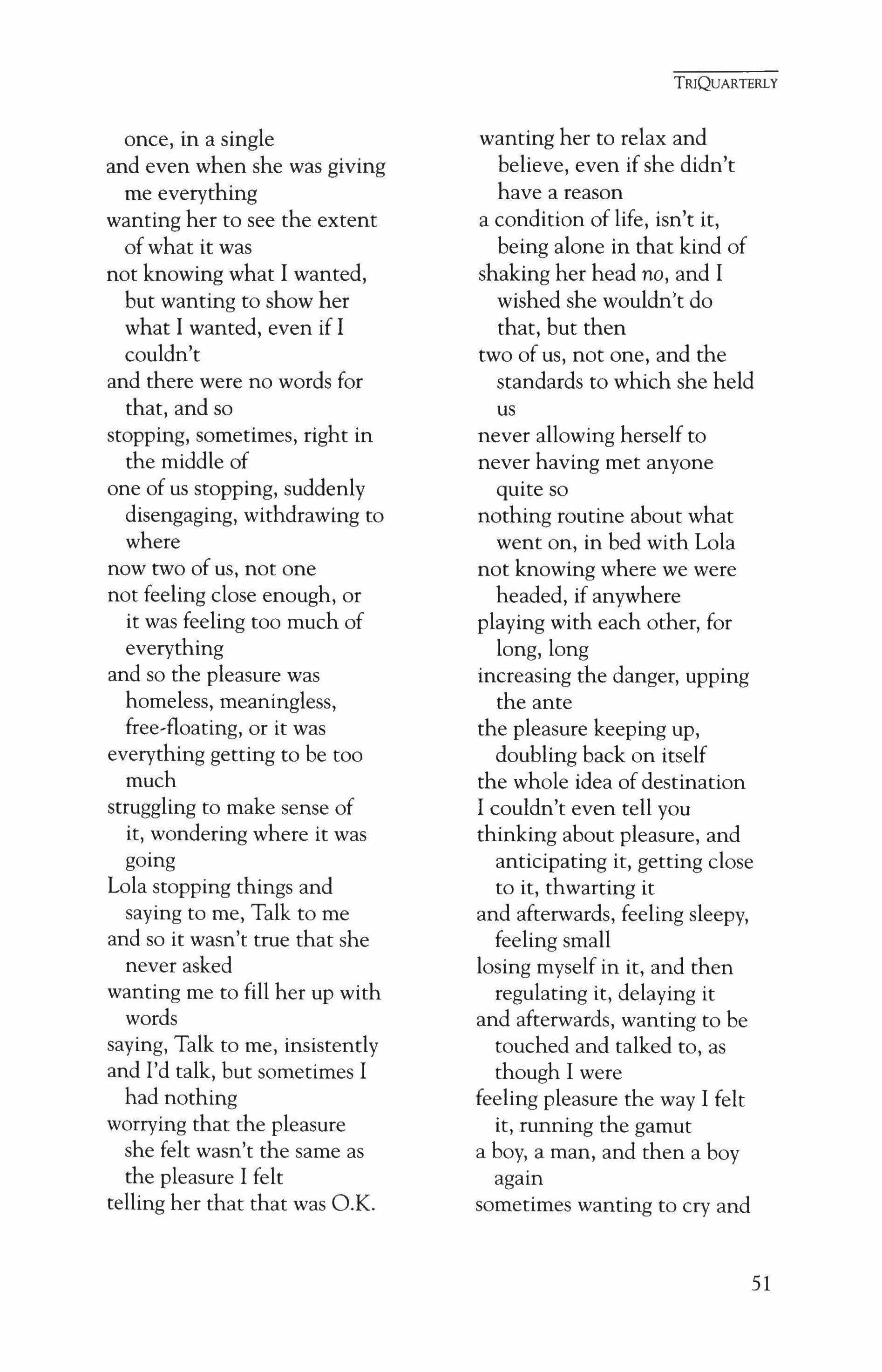 Publication of TriQuarterly is made possible in part by the donors of gifts and grants to the magazine. For their recent and continuing support, we are very pleased to thank the Illinois Arts Council, the Lannan Foundation, the John D. and Catherine T. MacArthur Foundation, the National Endowment for the Arts, the Sara Lee Foundation, the Wendling Foundation, and individual donors. Major new marketing initiatives at TriQuarterly have been made possible by the Lila Wallace,Reader's Digest Literary Publishers Marketing Development Program, funded through a grant to the Council of Literary Magazines and Presses.