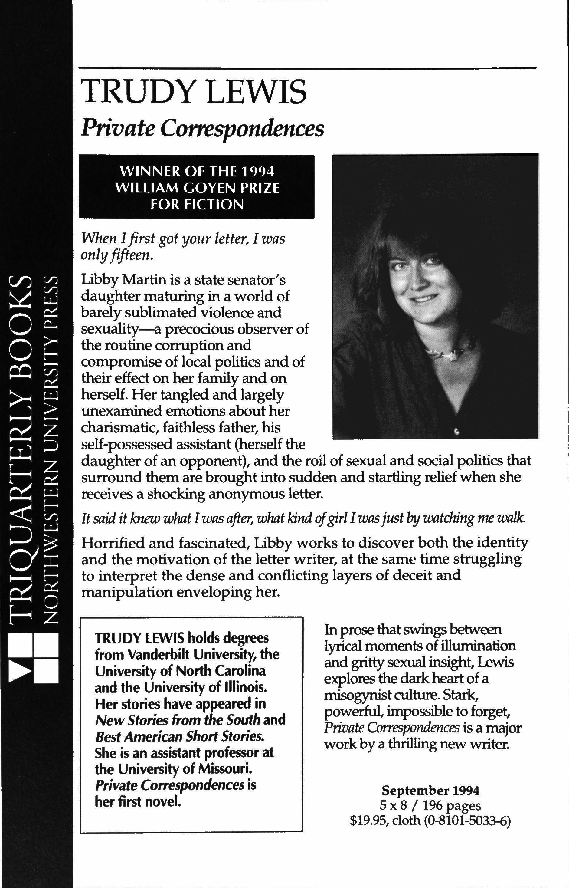 TRUDY LEWIS holds degrees from Vanderbilt University, the University of North Carolina and the University of Illinois. Her stories have appeared in New Stories from the South and Best American Short Stories. She is an assistant professor at the University of Missouri. Private Co"espondences is her first novel.