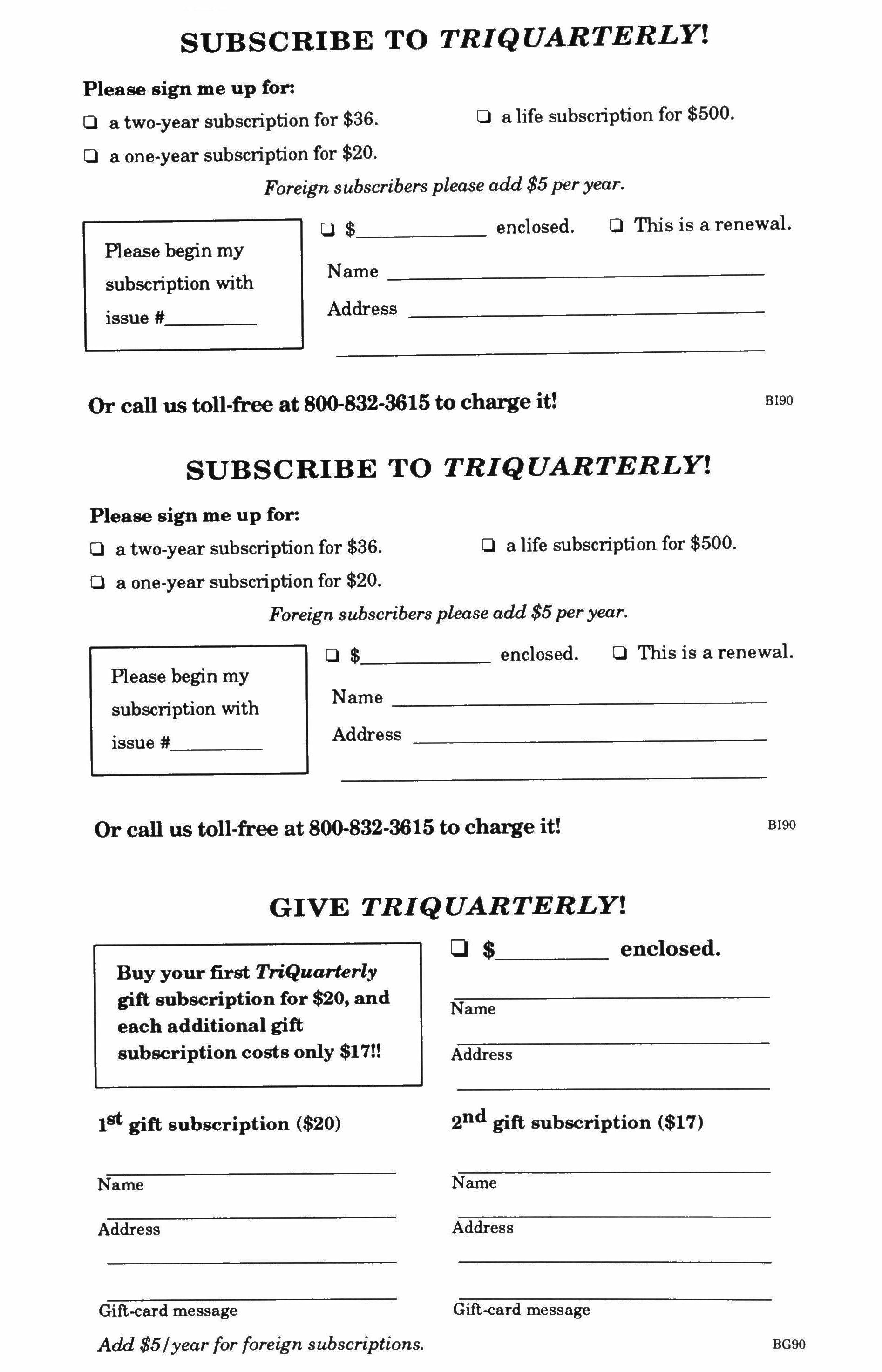 Name Address Or call US toll-free at 800-832-3615 to charge it! GIVE TRIQUARTERLY! o $ enclosed. Buy your first TriQuarlerly gift subscription for $20, and each additional gift subscription costs only $17!! Address Bl90 Name 1st gift subscription ($20) 2nd gift subscription ($17) Name Name Address Address Gift-card message Gift-card message Add $5/year for foreign subscriptions. BG90