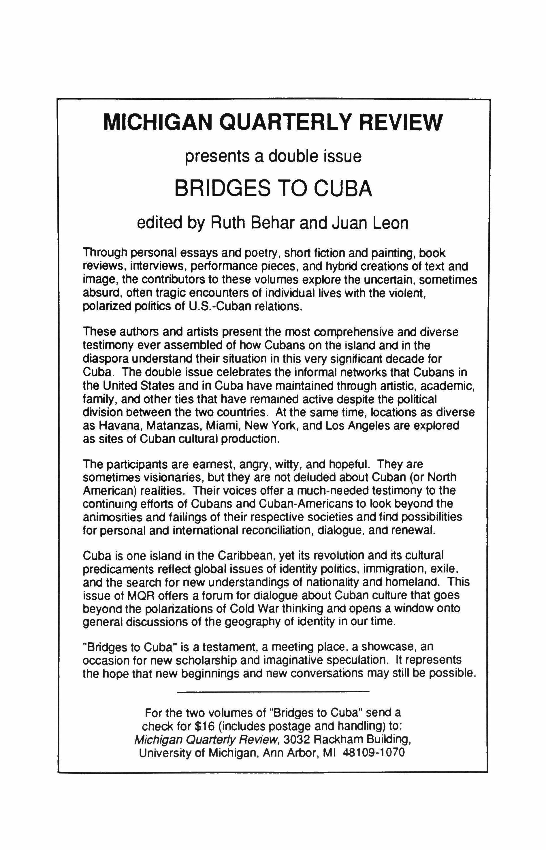 NOTE: TriQuarterly welcomes financial support in the form of donations, bequests and planned gifts. Please write to Reginald Gibbons, editor. Please see the last page and the inside back cover for names of individual donors to TriQuarterly.