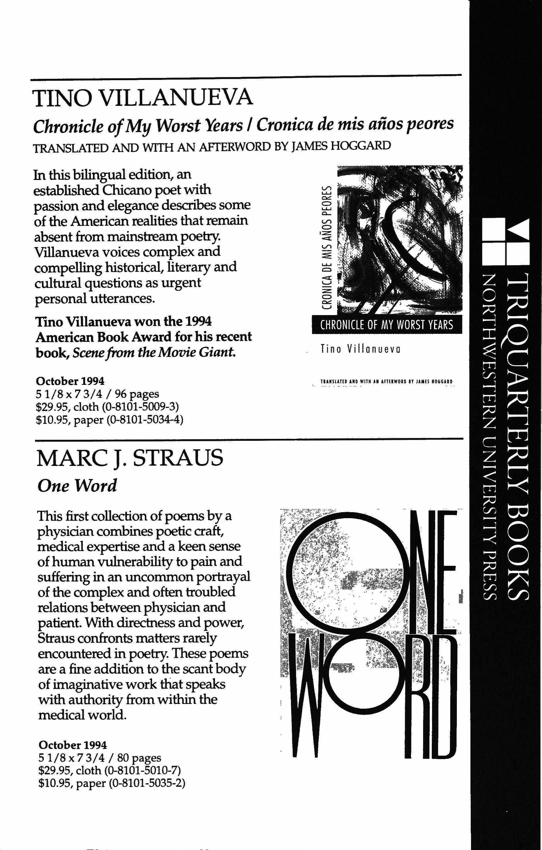 In this bilingual edition, an established Chicano poetwith passion and elegance describes some of the American realities that remain absent from mainstream poetry. Villanueva voices complex and compelling historical, literary and cultural questions as urgent personal utterances.