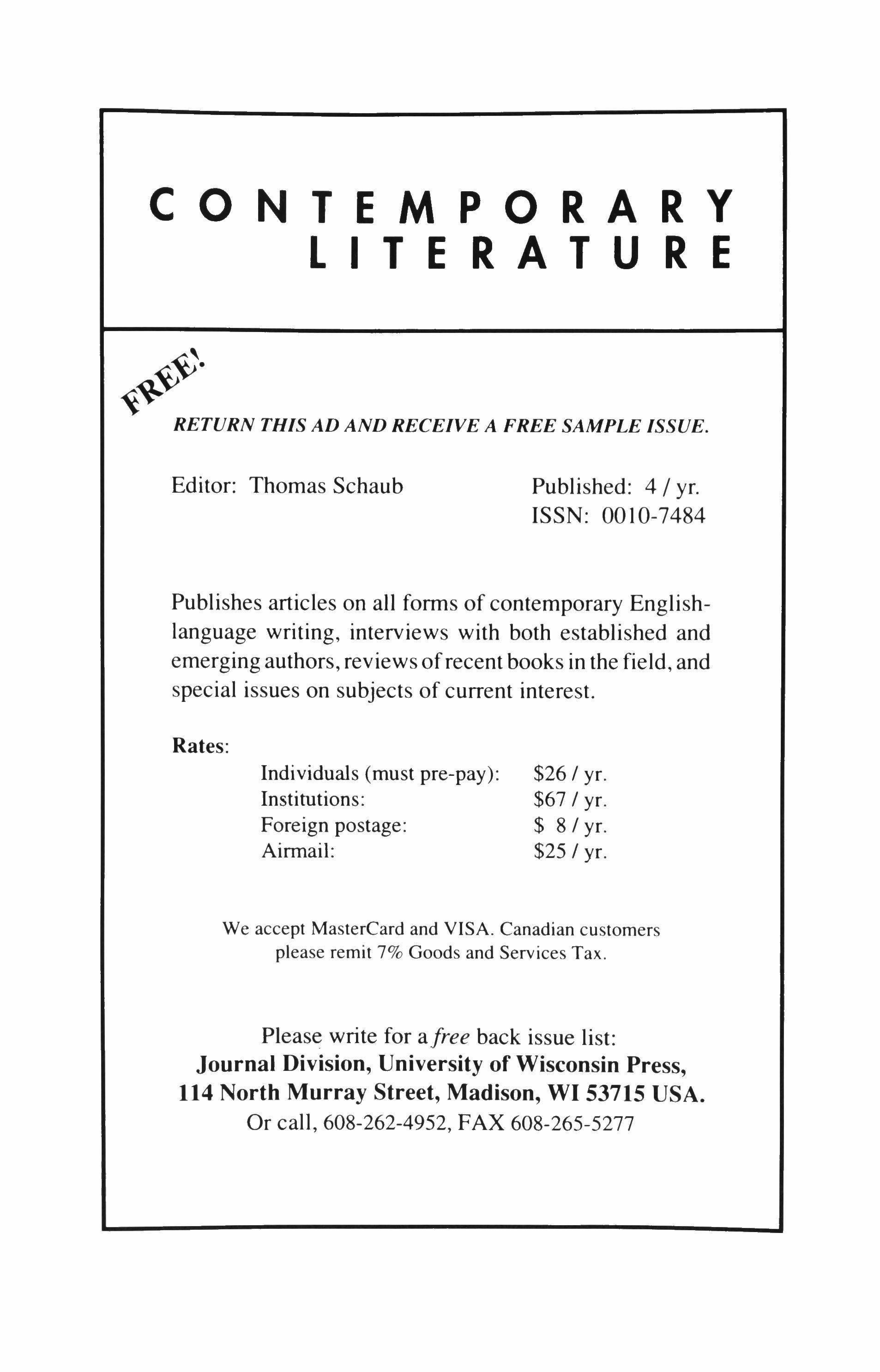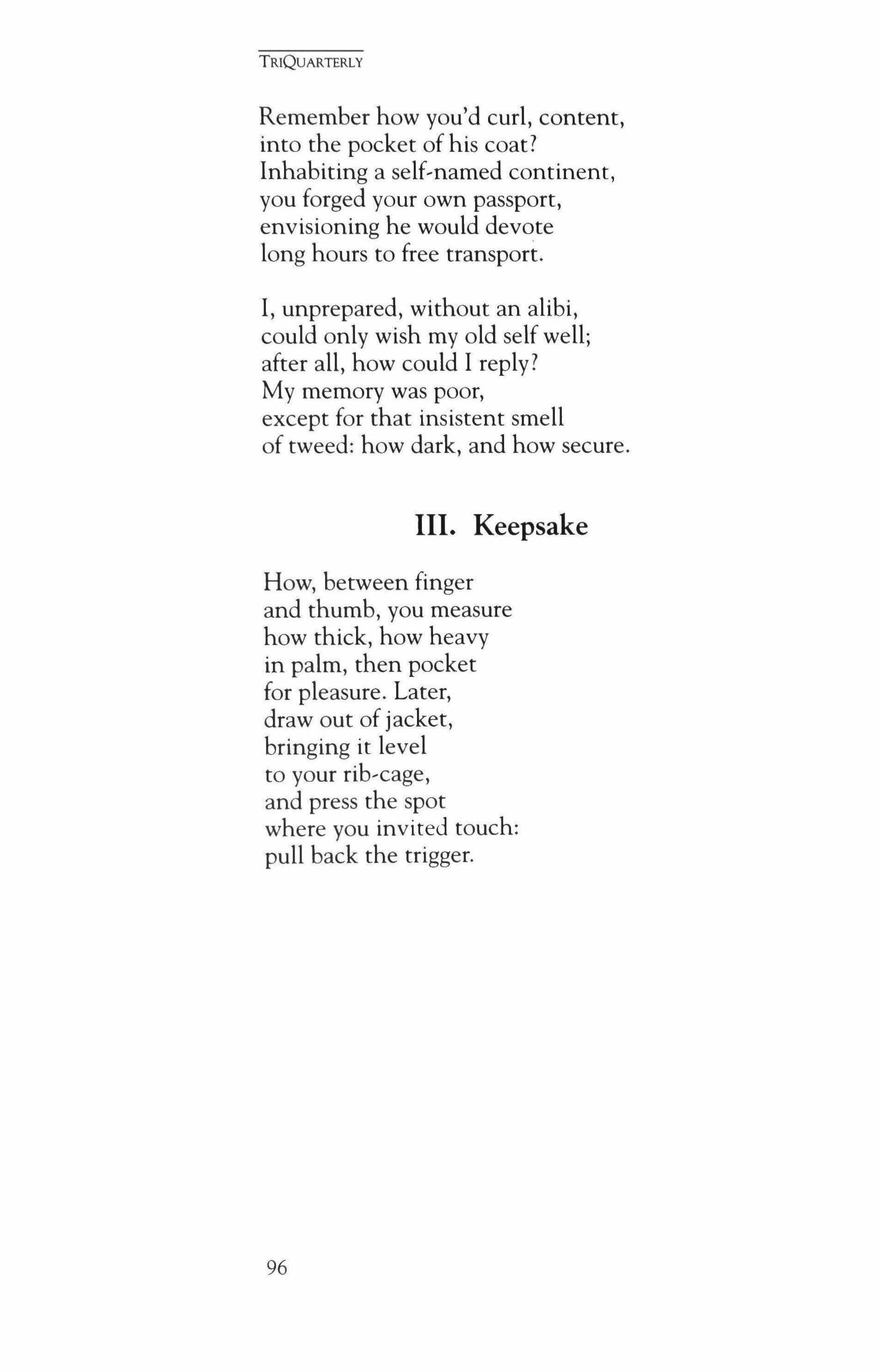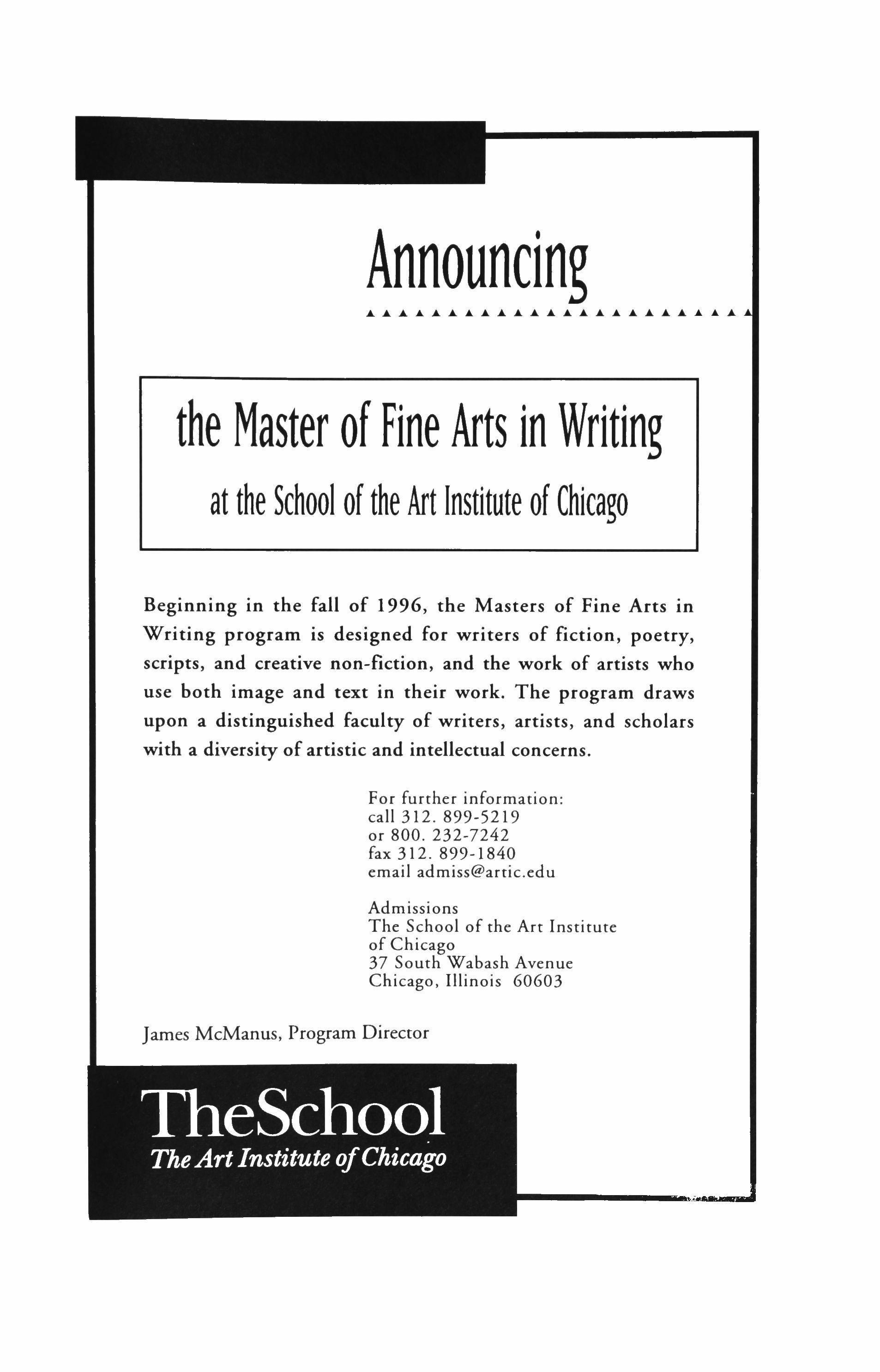 Subscription rates (three issues a year) - Individuals: one year $24; two years $44; life $600. Institutions: one year $36; two years $68. Foreign subscriptions $5 per year additional. Price of back issues varies. Sample copies $5. Correspondence and subscriptions should be addressed to TriQuarterly, NORTHWESTERN UNIVERSITY, 2020 Ridge Avenue, Evanston, IL 60208. Phone: (708) 491-7614. The editors invite submissions offiction, poetry and literary essays, which must be postmarked between October 1 and March 31; manuscripts postmarked between April 1 and September 30 will not be read. No manuscripts will be returned unless accompanied by a stamped, self-addressed envelope. All manuscripts accepted for publication become the property of TriQuarterly, unless otherwise indicated. Copyright © 1996 by TriQuarterly. No part of this volume may be reproduced in any manner without written permission. The views expressed in this magazine are to be attributed to the writers, not the editors or sponsors. Printed in the United States of America by Thomson-Shore; typeset by TriQuarterly. ISSN: 0041-3097.