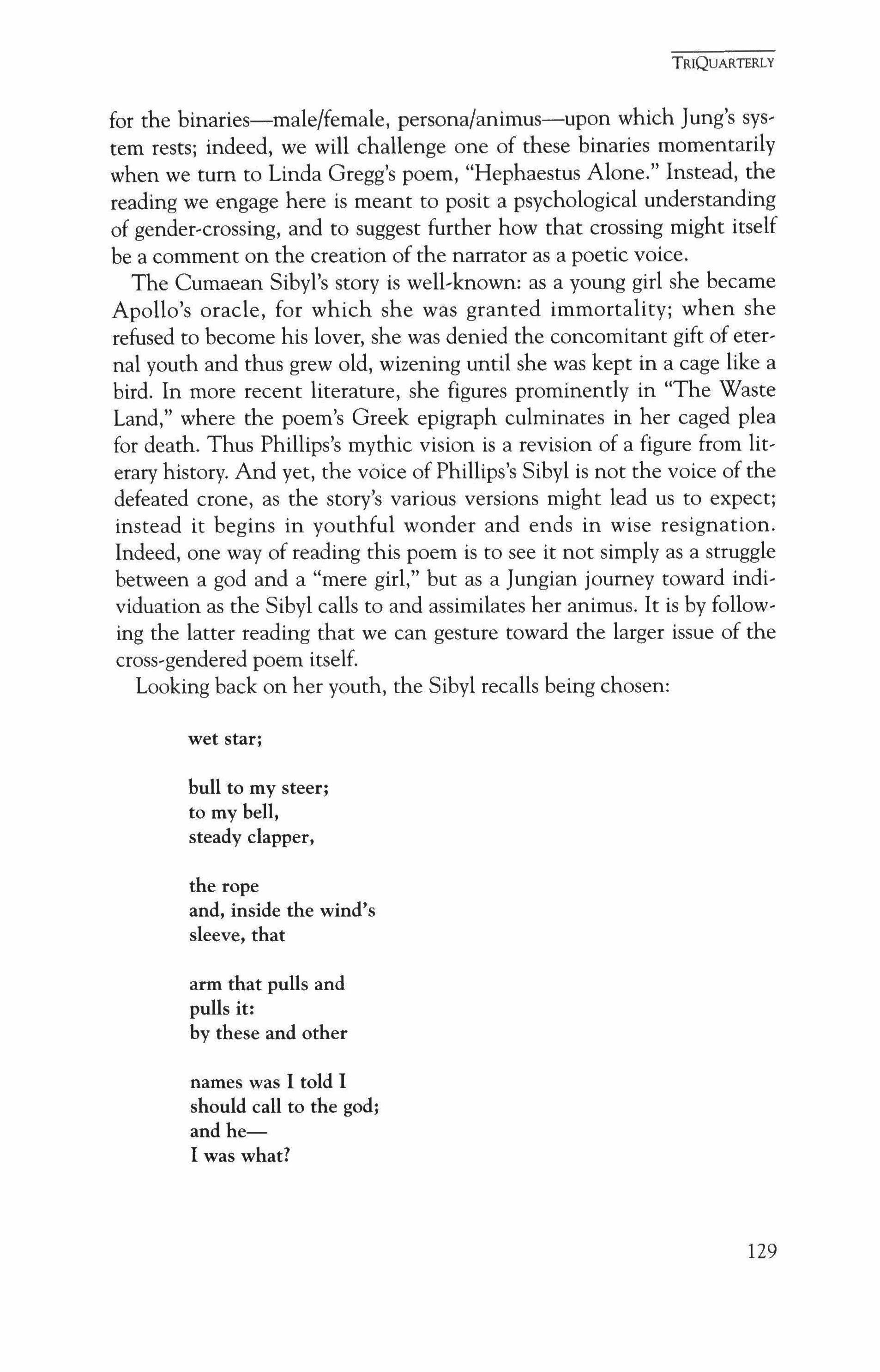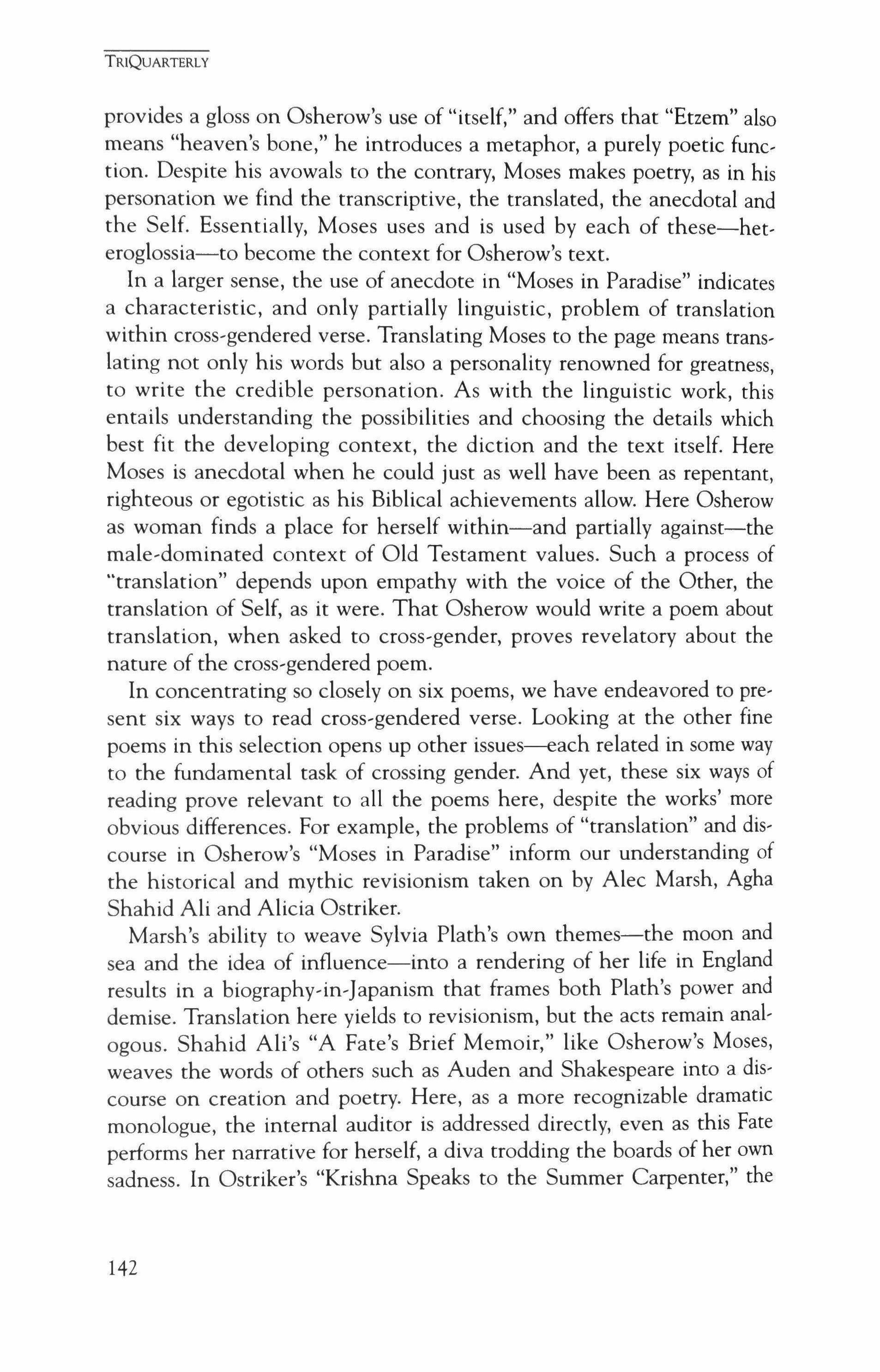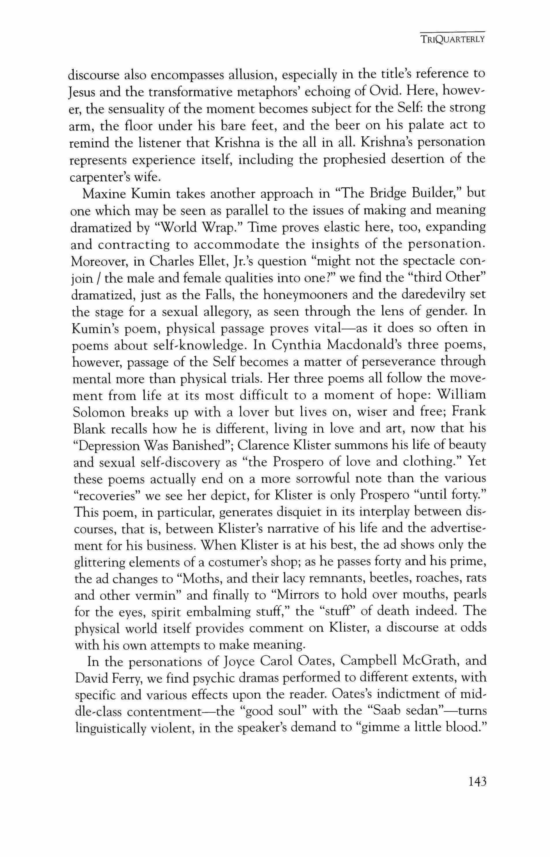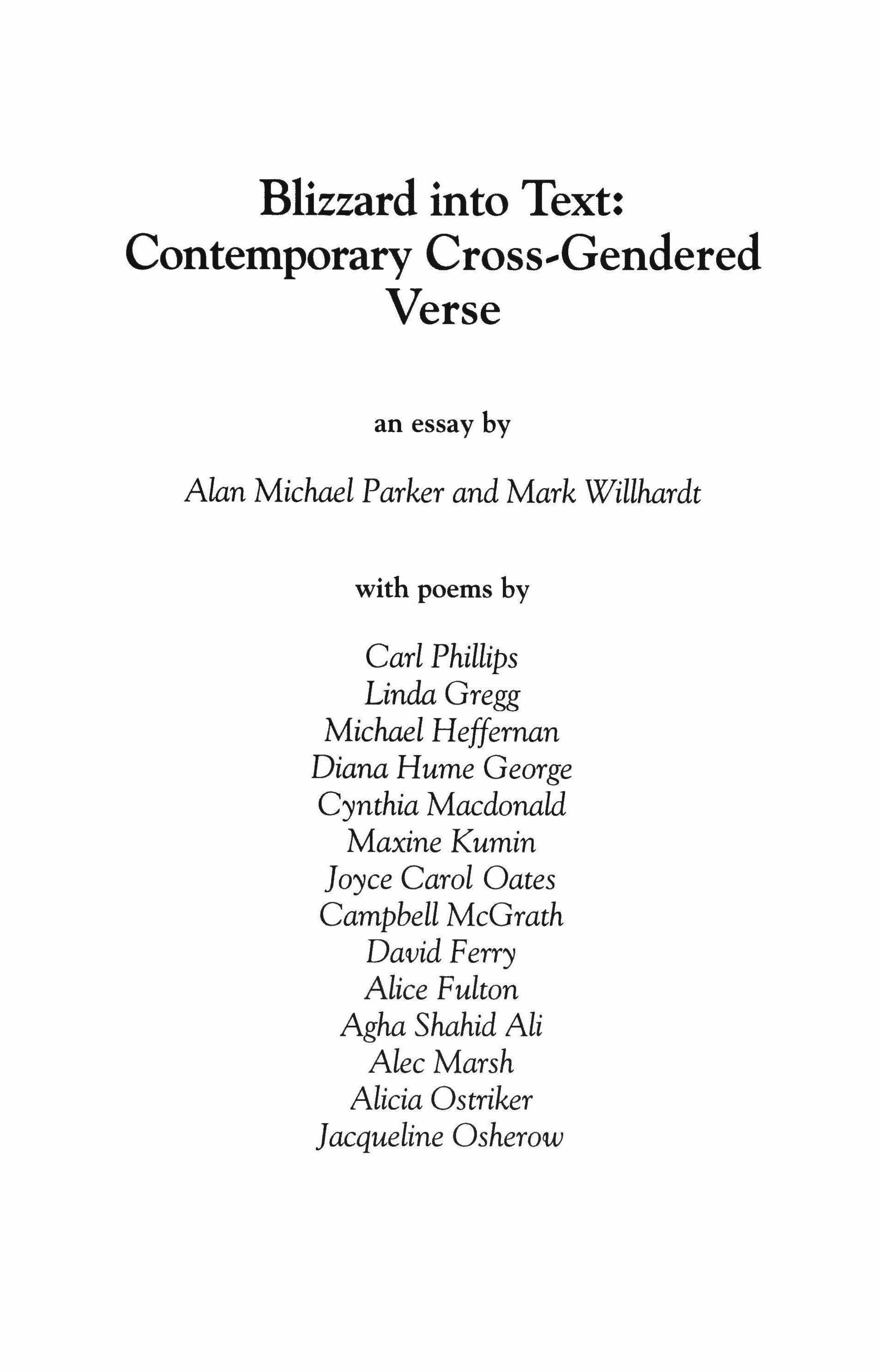 "Blizzard into Text: Contemporary Cross-Gendered Verse," an essay by Alan Michael Parker and Mark Willhardt with poems by Carl Phillips, linda Gregg, Michael Heffernan, Diana Hume George, Cynthia Macdonald, Maxine Kumin, Joyce Carol Oates, Campbell McGrath, David Ferry, Alice Fulton, Agha