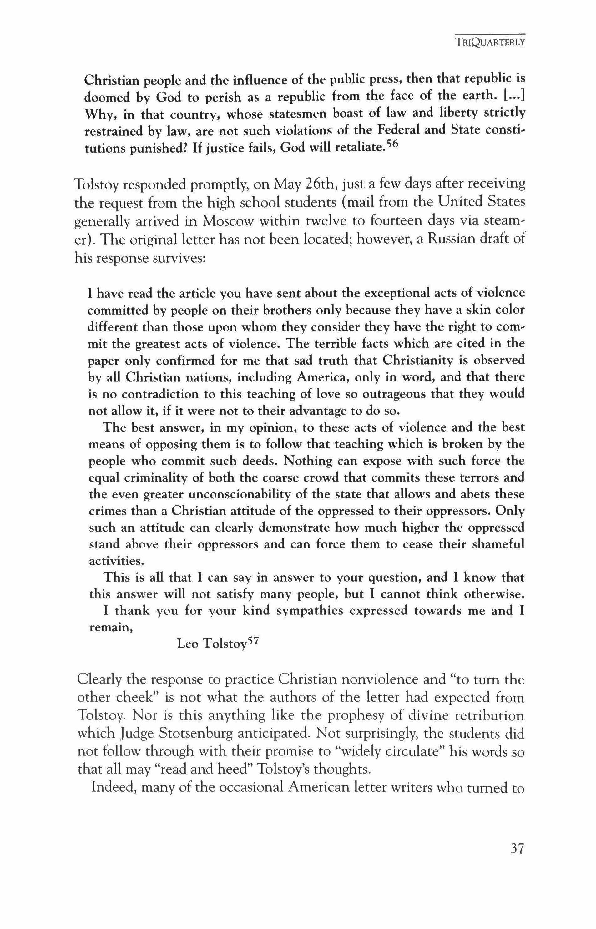 Tolstoy's position leaves no hope that any government, even the U.S., can avoid atrocities of the sort Welsh deplored. What to the American seemed the exception, to Tolstoy was the rule. His uncompromising positions would often surprise and disappoint his American correspondents, and this pattern recurred not only in discussions of politics, but also in matters of religious faith and morality.