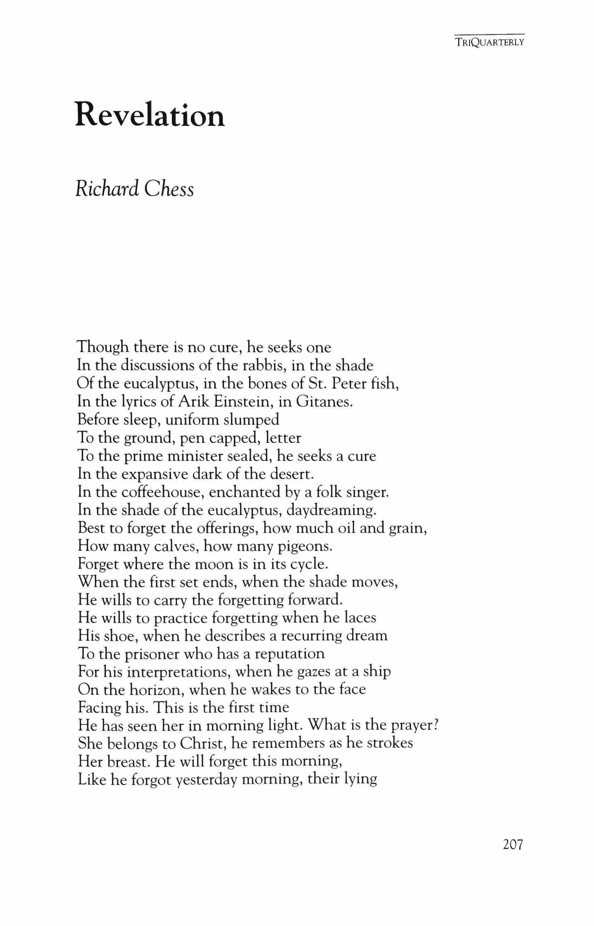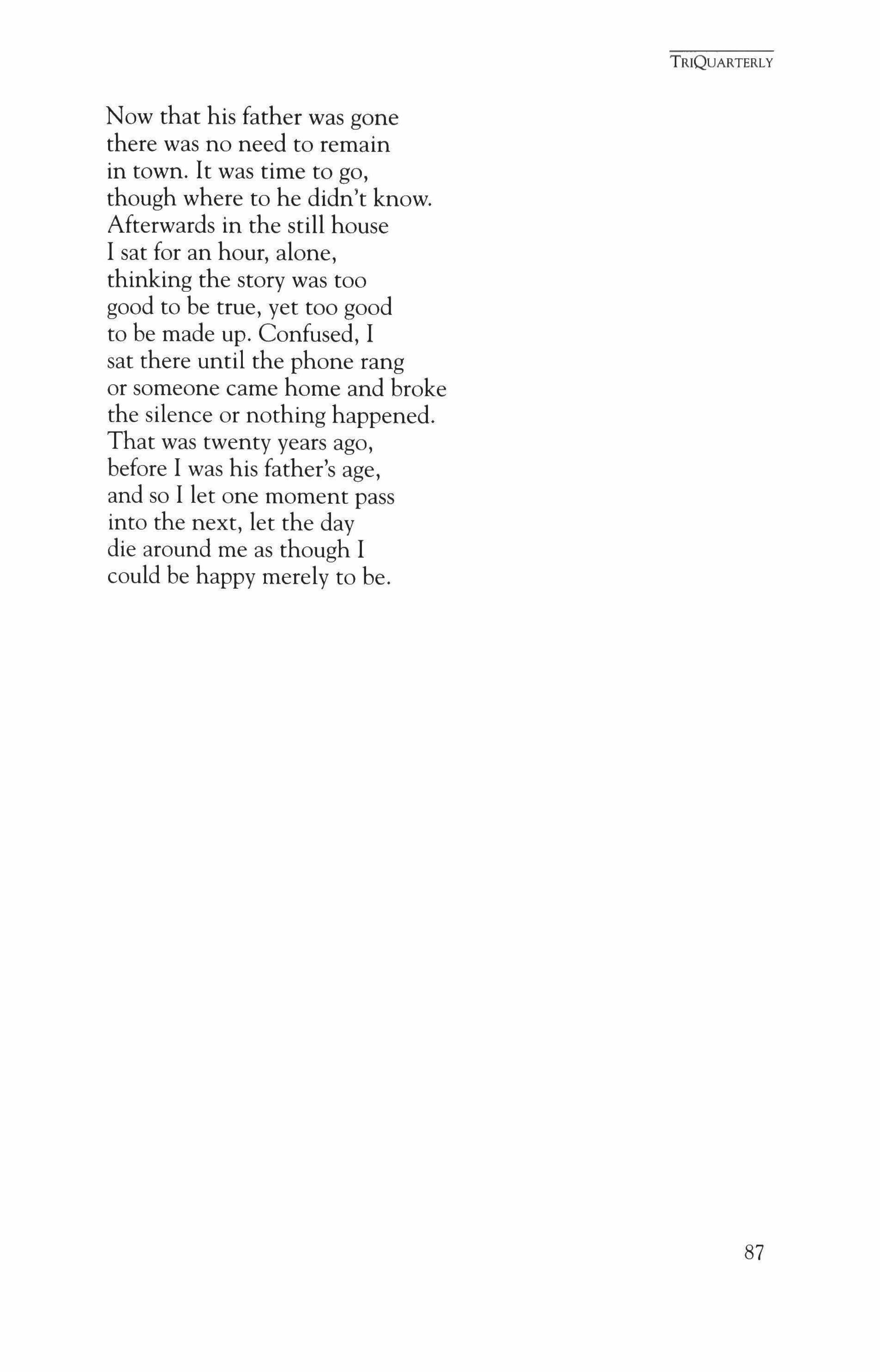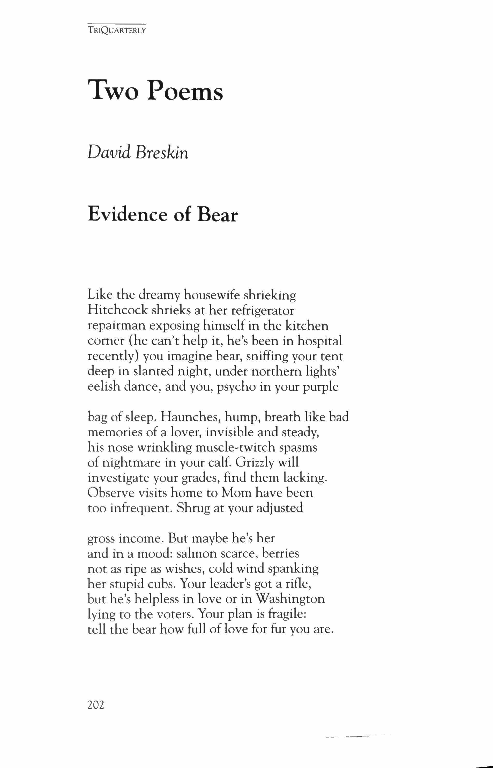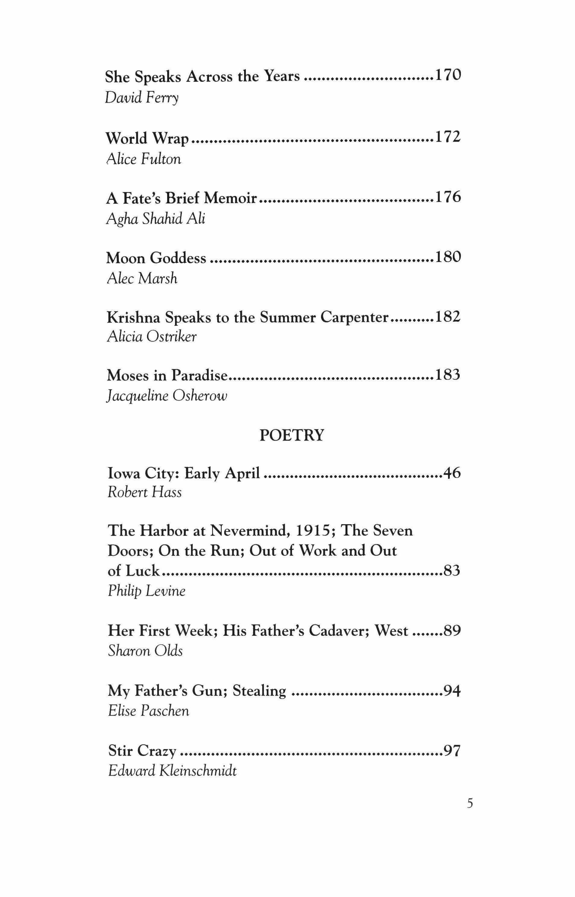 The Sex 99 Billy Collins No Sorry 200 Catherine Bowman Evidence of Bear; The Day I Take Her to the Hospital 202 David Breskin Revelation 207 Richard Chess Ragtime 209 David Zivan First Death; Around the World; First Language 211 Ann Townsend The Widow 215 Alan Michael Parker