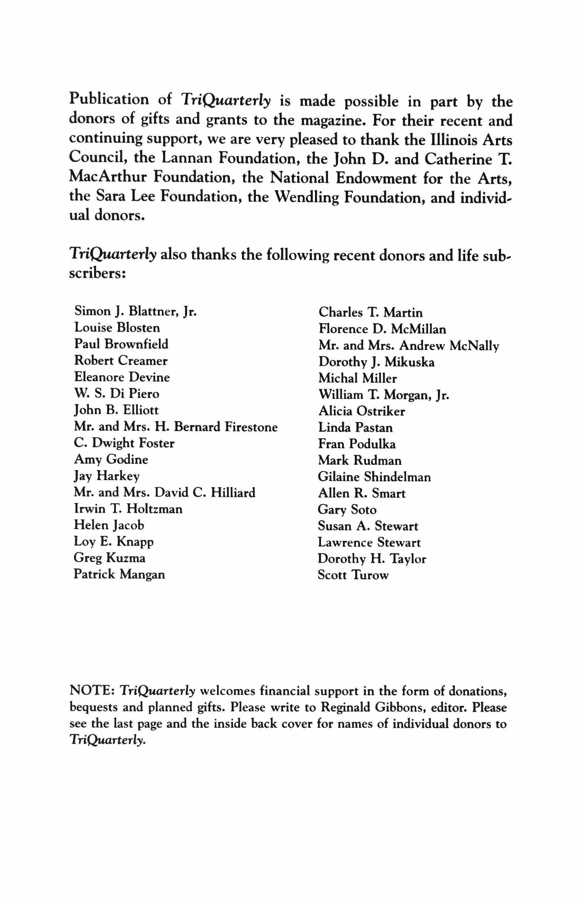 NOTE: TriQuarterly welcomes financial support in the form of donations, bequests and planned gifts. Please write to Reginald Gibbons, editor. Please see the last page and the inside back cover for names of individual donors to TriQuarterly.