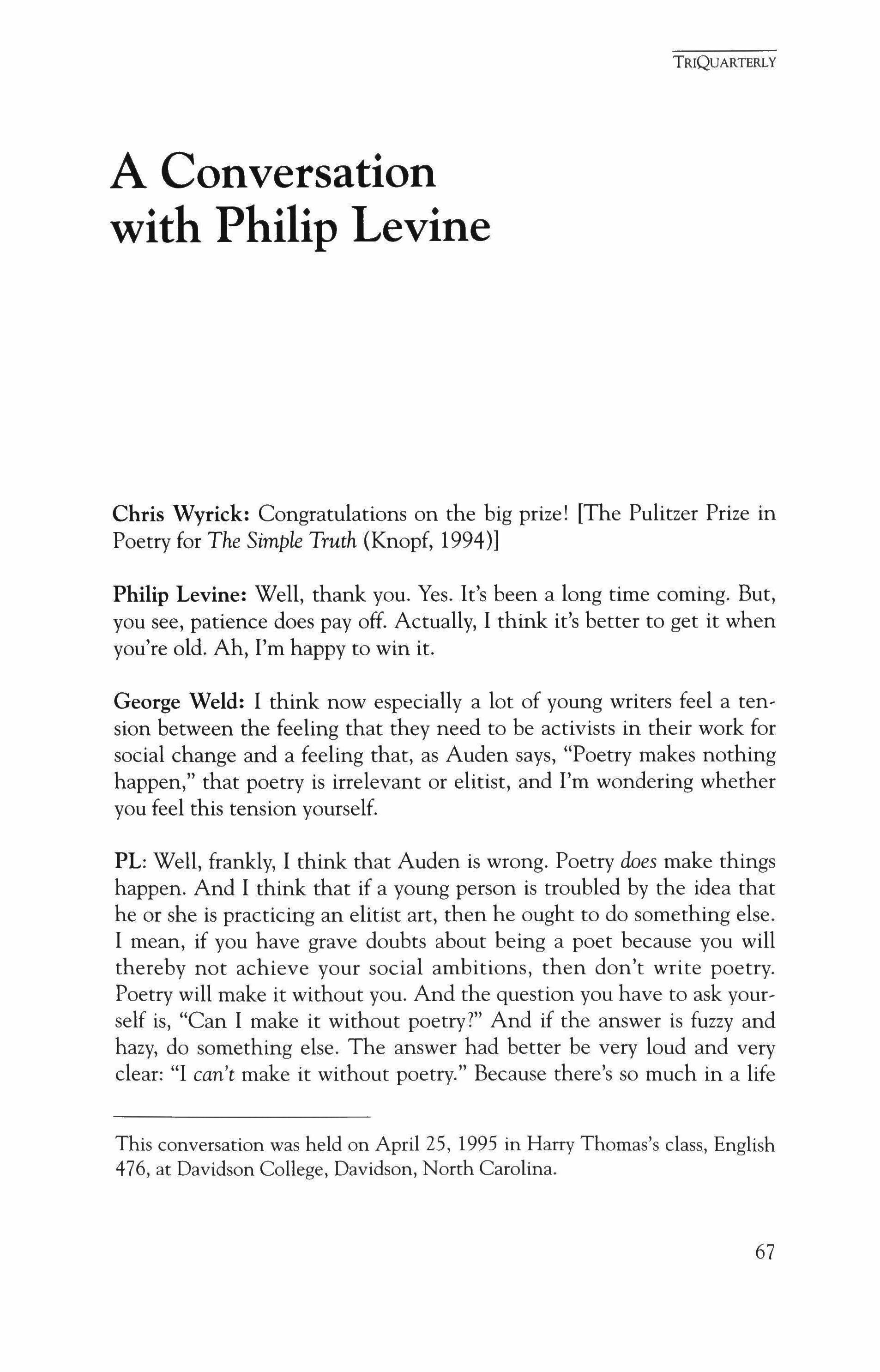 Philip levine talks with Harry Thomas's students, plus new poems
