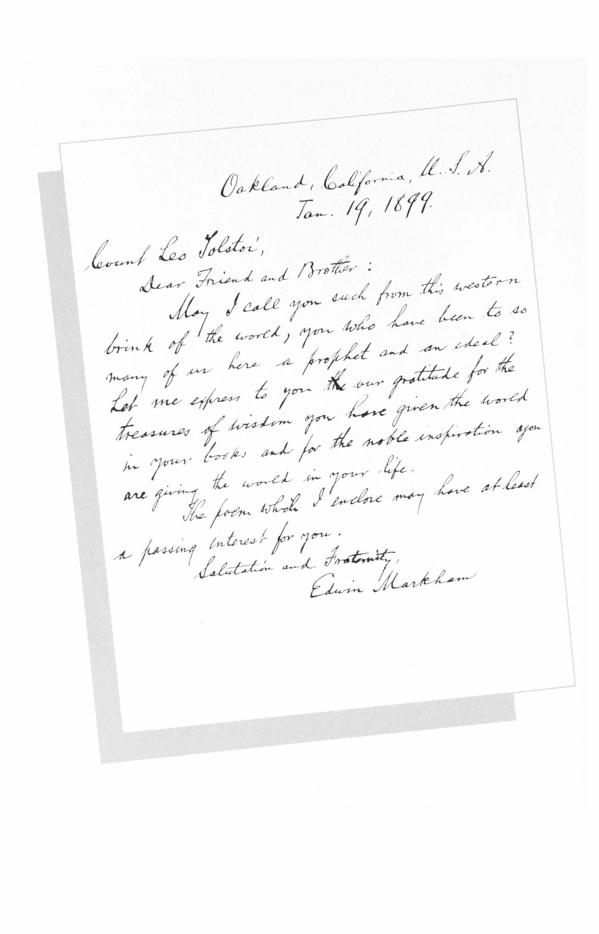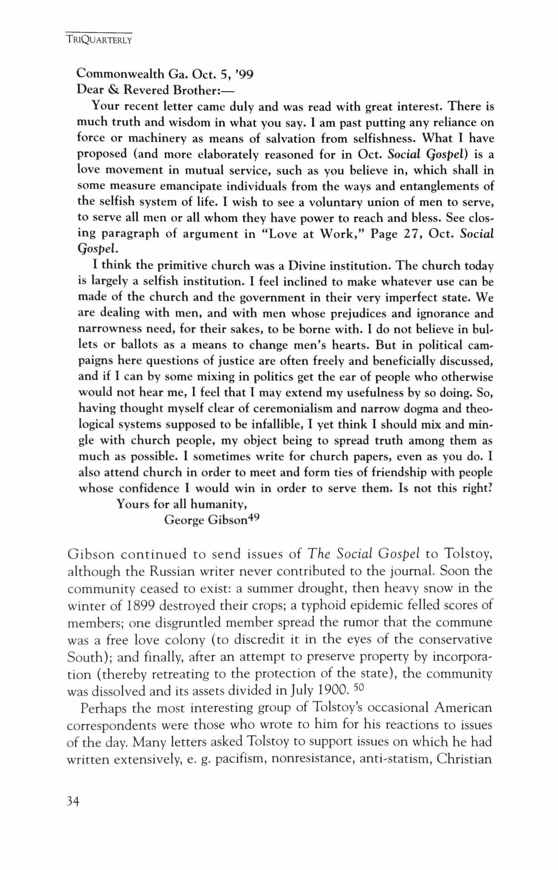 Caught up with the moral and religious message of Tolstoy, Americans wrote him over 1,700 letters.2 (This number, given Russian government censorship, is probably less than the number of letters sent and does not include hundreds of books, pamphlets and other publica, tions received from the U.S.) These American correspondents provide a fresh indication of who was reading Tolstoy and how these average read, ers reacted to his works. Surprisingly, there are very few letters from leading American political, social or intellectual figures. The only politician of national reputation to write was William Jennings Bryan; the most prominent social activists to contact him were Henry George, Frances E. Willard (head of the Women's Christian Temperance Union), Clara Barton and Jane Addams (who visited him but did not write); and among writers and poets, only Edward Markham. Who then comprised his American correspondents? A remarkably various collection of men and women who shared Tolstoy's concern for "true" Christianity and the teachings of Christ, for nonviolence and nonresistance, for social justice, for abstinence from meat, alcohol, political activity and sexual relations, for land reform and the single tax, for free' dom from government interference and coercion. Their reasons for writ, ing were equally varied: to share religious and moral views inspired by his works; to ask for interpretations of his writings; to receive his reactions to their own writings; to share views of other writers; to explain their own similar ideas; to receive his advice on troubling questions; and even simply to get Tolstoy's autograph.