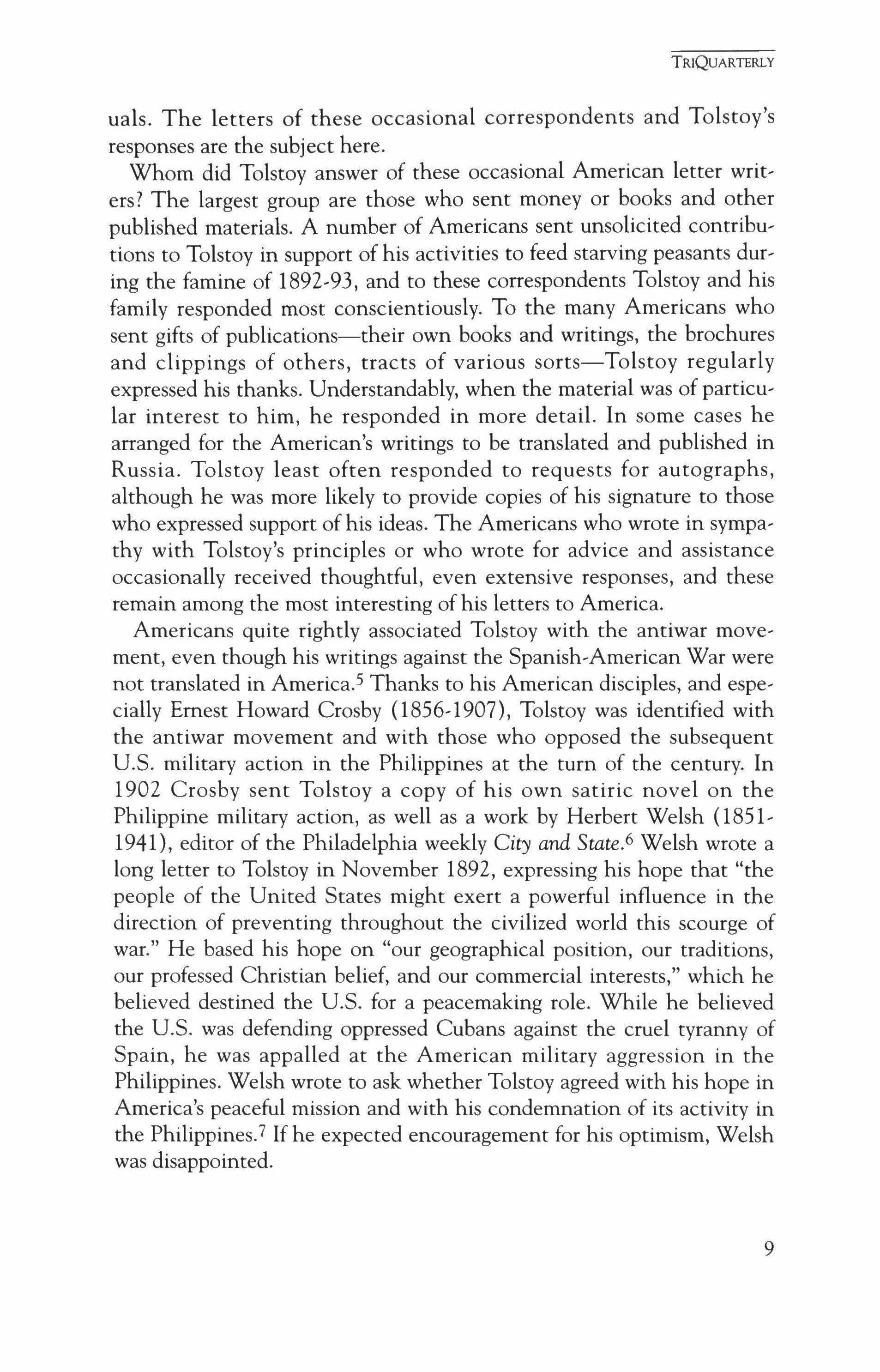 Americans quite rightly associated Tolstoy with the antiwar move, ment, even though his writings against the Spanish-American War were not translated in Arnerica.l Thanks to his American disciples, and especially Ernest Howard Crosby (1856,1907), Tolstoy was identified with the antiwar movement and with those who opposed the subsequent U.S. military action in the Philippines at the turn of the century. In 1902 Crosby sent Tolstoy a copy of his own satiric novel on the Philippine military action, as well as a work by Herbert Welsh (1851, 1941), editor of the Philadelphia weekly City and State.6 Welsh wrote a long letter to Tolstoy in November 1892, expressing his hope that "the people of the United States might exert a powerful influence in the direction of preventing throughout the civilized world this scourge of war." He based his hope on "our geographical position, our traditions, our professed Christian belief, and our commercial interests," which he believed destined the U.S. for a peacemaking role. While he believed the U.S. was defending oppressed Cubans against the cruel tyranny of Spain, he was appalled at the American military aggression in the Philippines. Welsh wrote to ask whether Tolstoy agreed with his hope in America's peaceful mission and with his condemnation of its activity in the Philippines." If he expected encouragement for his optimism, Welsh was disappointed.