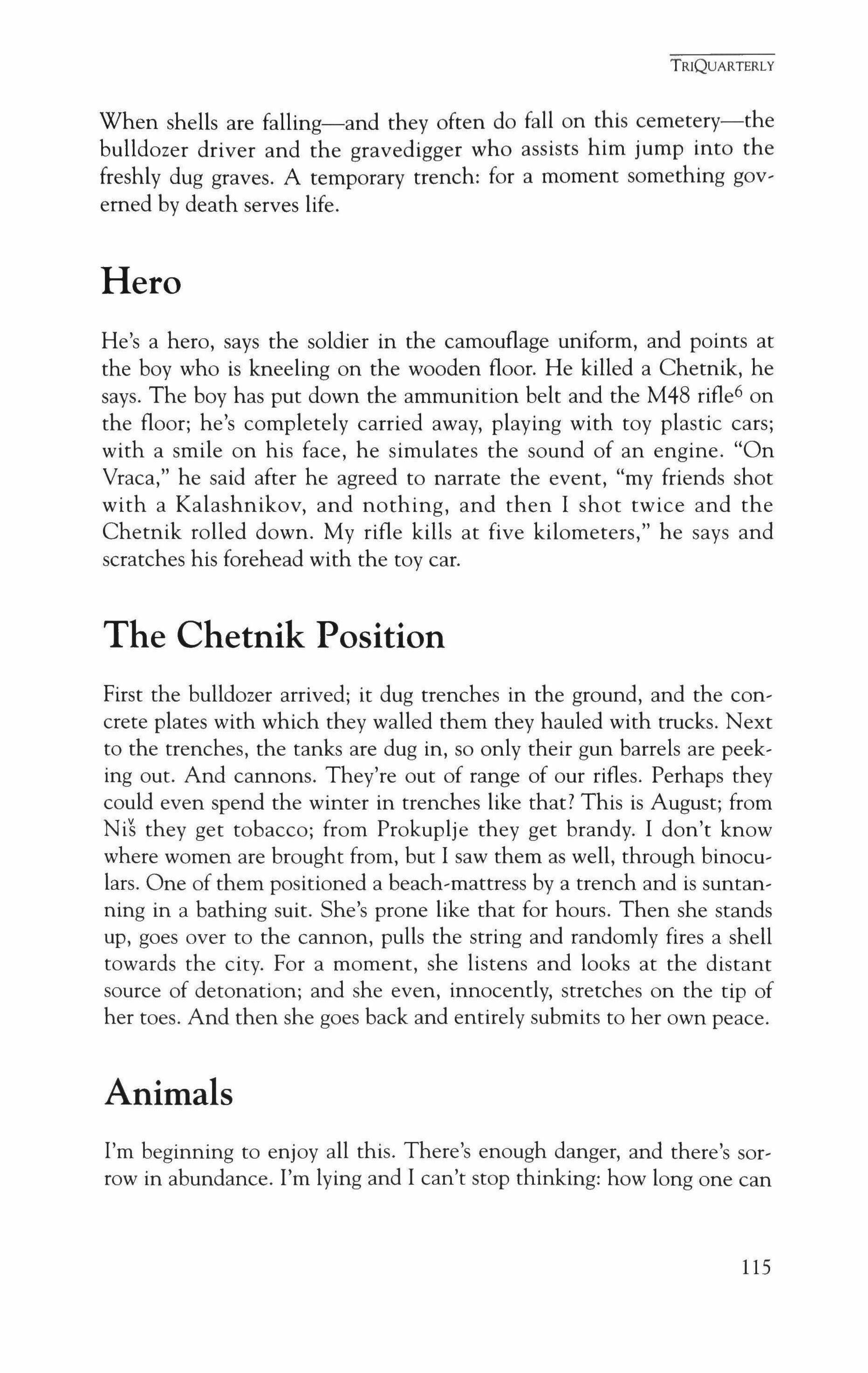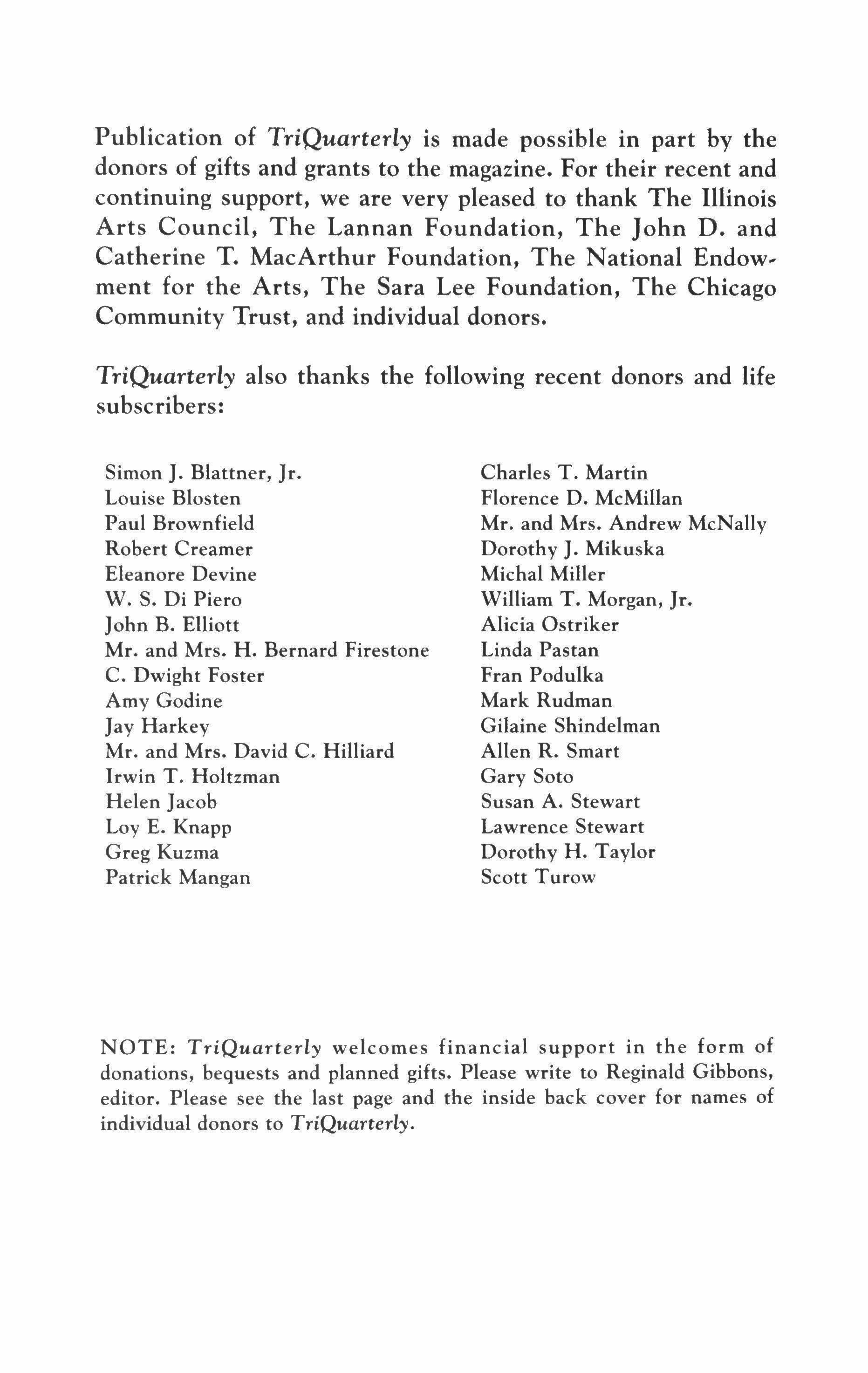 NOTE: TriQuarterly welcomes financial support in the form of donations, bequests and planned gifts. Please write to Reginald Gibbons, editor. Please see the last page and the inside back cover for names of individual donors to TriQuarterly.