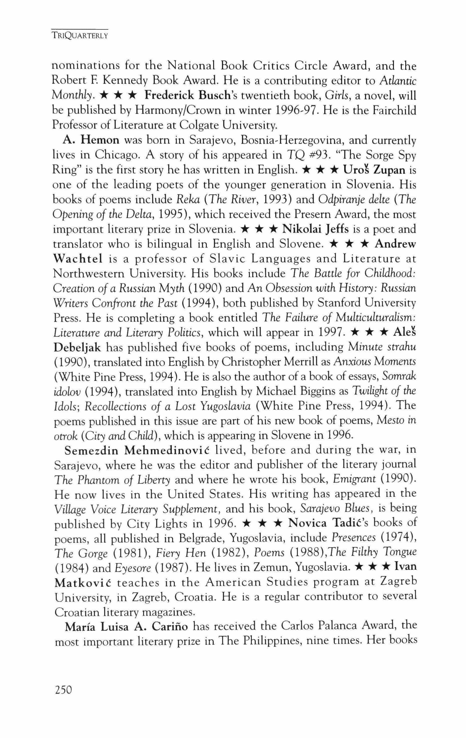 Subscription rates (three issues a year) - Individuals: one year $24; two years $44; life $600. Institutions: one year $36; two years $68. Foreign subscriptions $5 per year additional. Price of back issues varies. Sample copies $5. Correspondence and subscriptions should be addressed to TriQuarterly, NORTHWESTERN UNIVERSITY, 2020 Ridge Avenue, Evanston, IL 60208. Phone: (847) 491-7614. The editors invite submissions offiction, poetry and literary essays, which must be postmarked between October 1 and March 31; manuscripts postmarked between April 1 and September 30 will not be read. No manuscripts will be returned unless accompanied by a stamped, self-addressed envelope. All manuscripts accepted for publication become the property of TriQuarterly, unless otherwise indicated. Copyright © 1996 by TriQuarterly. No part of this volume may be reproduced in any manner without written permission. The views expressed in this magazine are to be attributed to the writers, not the editors or sponsors. Printed in the United States of America by Thomson-Shore; typeset by TriQuarterly. ISSN: 0041-3097.