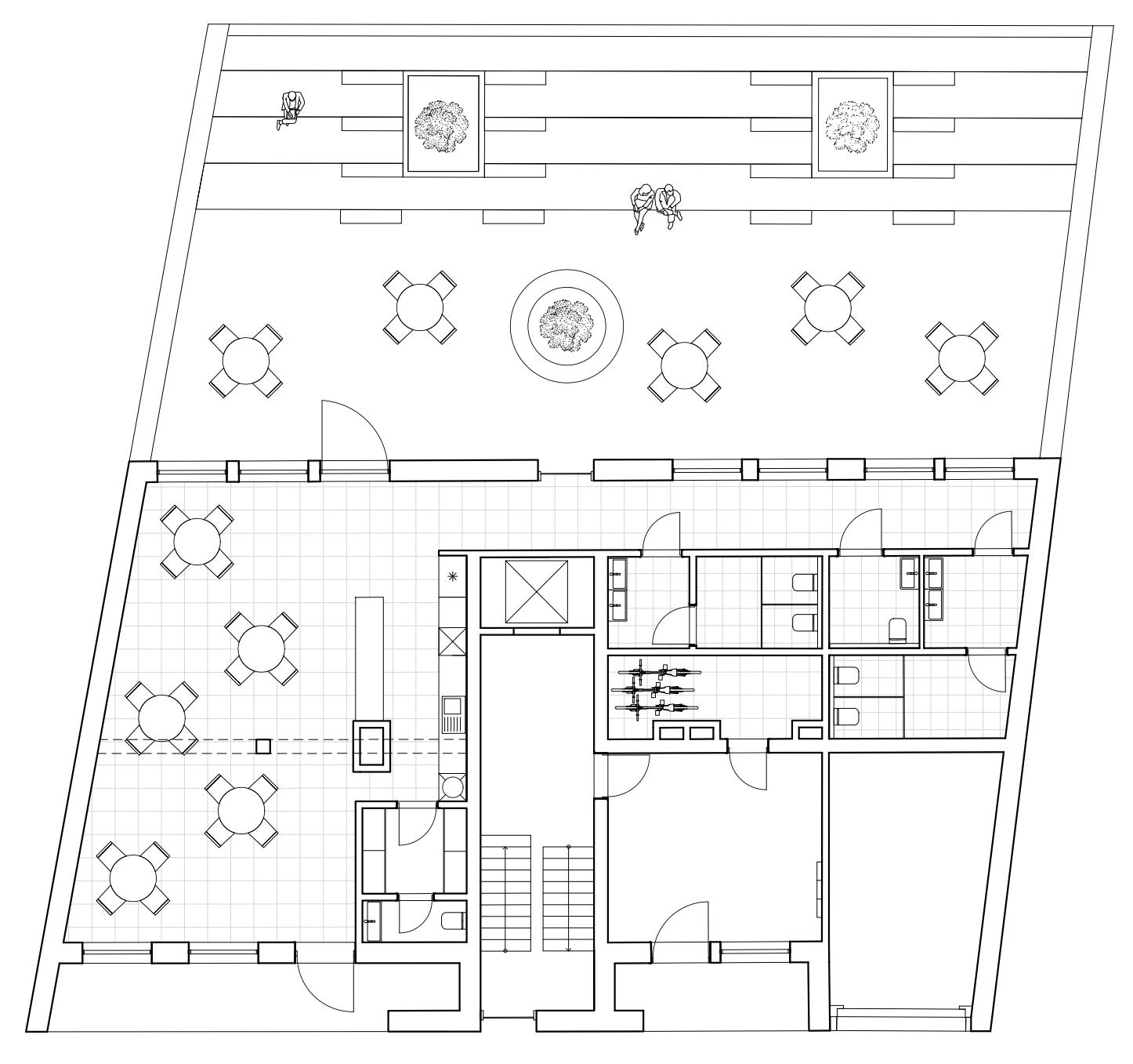 Návrh s zaměřuje na začlenění do kontextu historického centra. Obytná část bytového komplexu se skládá ze šesti jednotek, navržených pro 1 až 2 osoby, s důrazem na efektivitu prostoru a využívání přirozeného světla. Fasáda budovy respektuje tradiční stavební materiály a architektonické prvky, zajišťující harmonický soulad s okolní zástavbou. V suterénu je vyhrazena garážová část, řešící parkovací potřeby obyvatel a minimalizující dopad na vizuální estetiku města. Komunitní aspekt projektu je zdůrazněn umístěním kavárny v přízemí s přilehlou zahrádkou, nabízející nejen služby pro obyvatele, ale také oživující veřejný prostor a podporující společenské interakce.