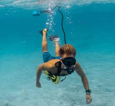 With speeds of up to 3 meters per second (or roughly 10 miles per hour), the jetpack features a unique quickattach harness that can be donned in seconds. Divers control thrust at a squeeze of the trigger and direction simply by moving their body. In between flights, divers can scoot across the surface or comfortably catch their breath with the buoyant harness. CudaJet is waterproof to 100 meters (330 feet),