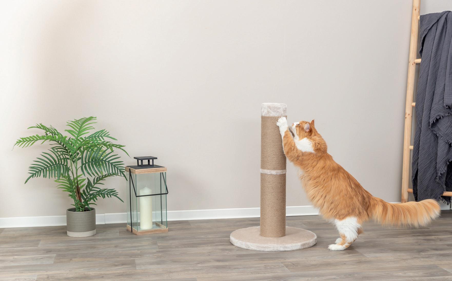 Den kraftiga pelaren med extra tjock jute bjuder in till både lek och klös, medan den extra tunga basplattan ger trygg stabilitet.