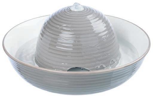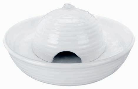 Vattenfontän i keramik Fontän är ett bra sätt att erbjuda din katt eller hund tillgång till friskt vatten. Rinnande vatten uppmuntrar dessutom djuren till att dricka mer frekvent. Det är fördelaktigt för hälsan och kan förebygga bekymmer med t ex njurar och urinvägar. Kupolens rä ade mönster skapar en vågrörelse på vattnet som gör det mer tilltalande att dricka från. Den robusta fontänen står stadigt och cirkulationen håller vattnet syresatt och fräscht. Utbytbara filter renar från smuts och päls. Lätt att rengöra. Drivs med tystgående justerbar pump.