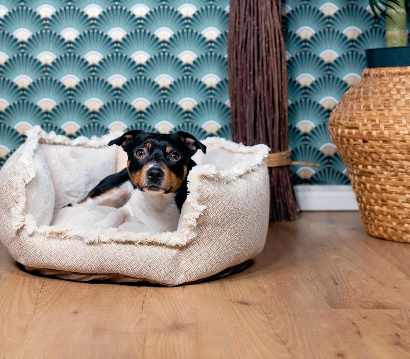 Mjuk och bekväm Boho-inspirerad bädd. Utsida i bomullstyg och insida med värmande plysch. Den tjocka stoppningen ger både stöd och trygghet för din bästa vän.