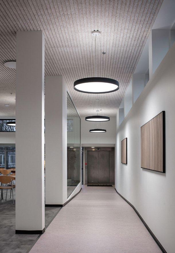 at loftspladerne, og dermed hele loftsfladen, glider sammen til én sammenhængende enhed. Gangzonen på langs, som kun er adskilt med glasvægge fra kantinen, bliver også en del af kantinen ved at have en del af den samme loftsflade.