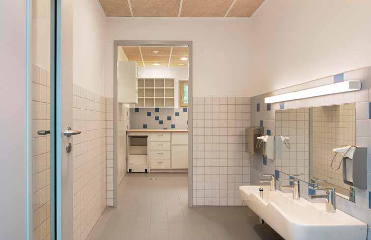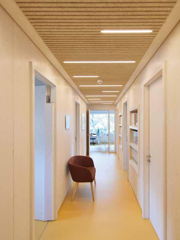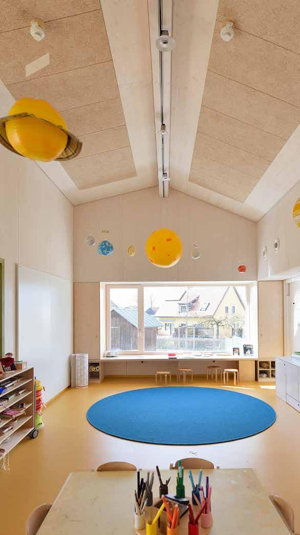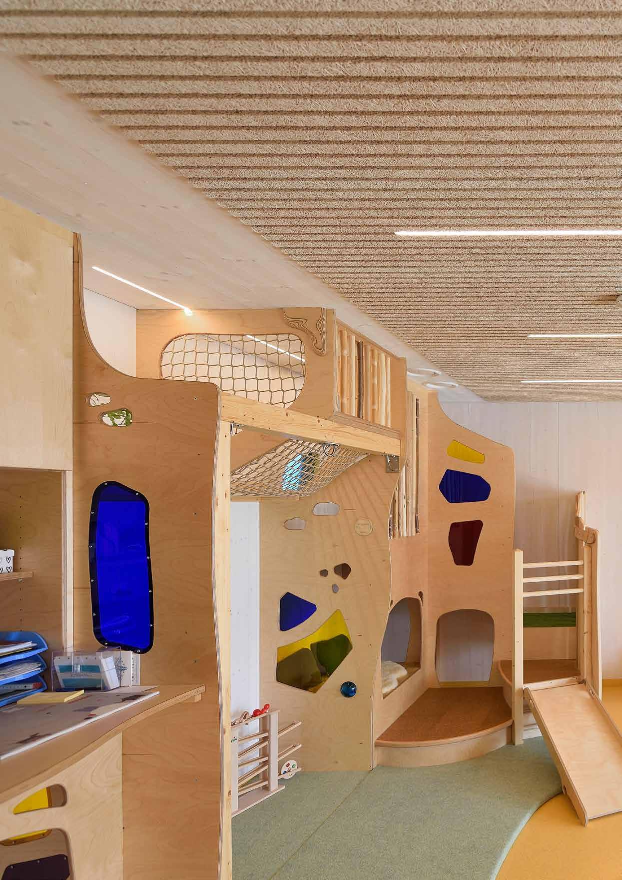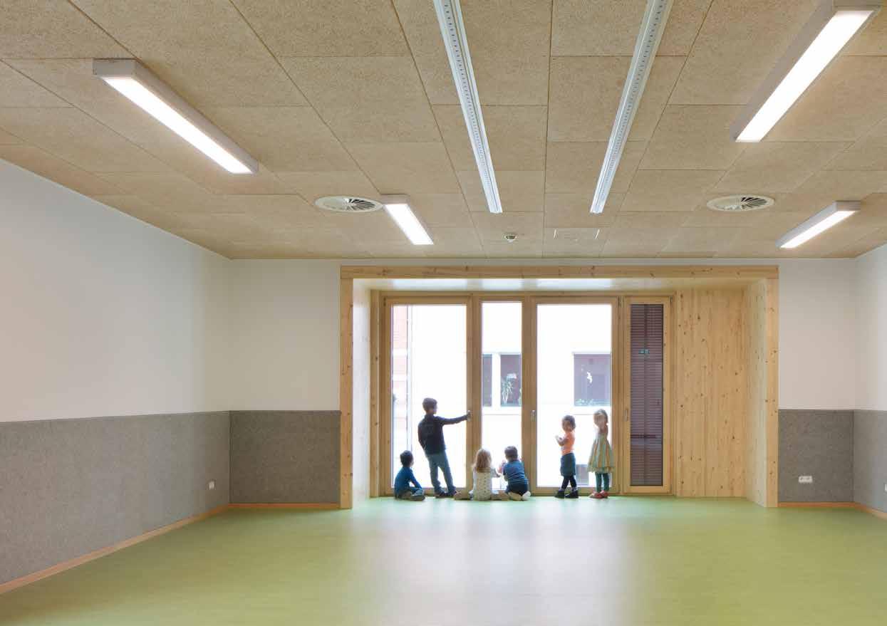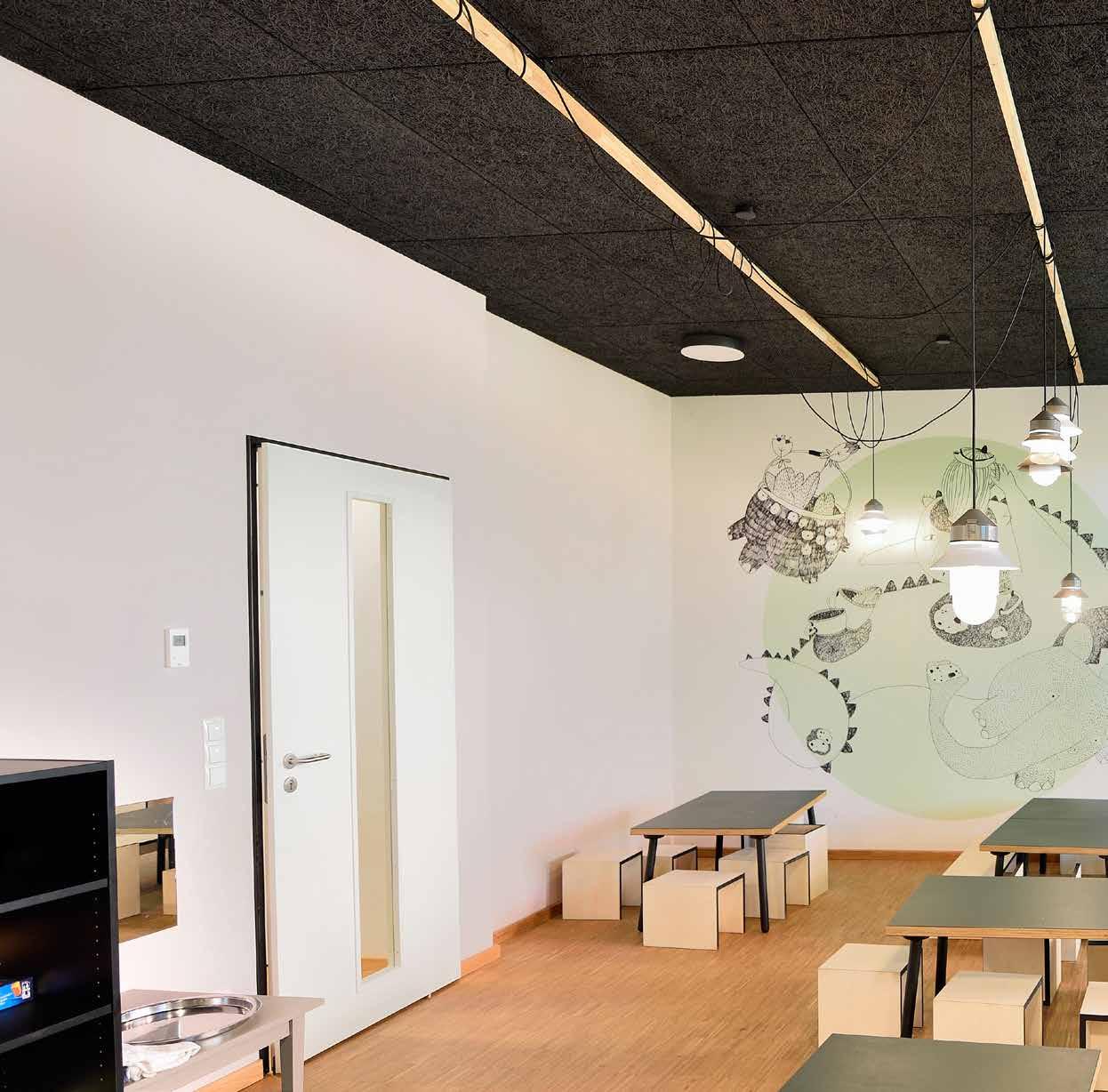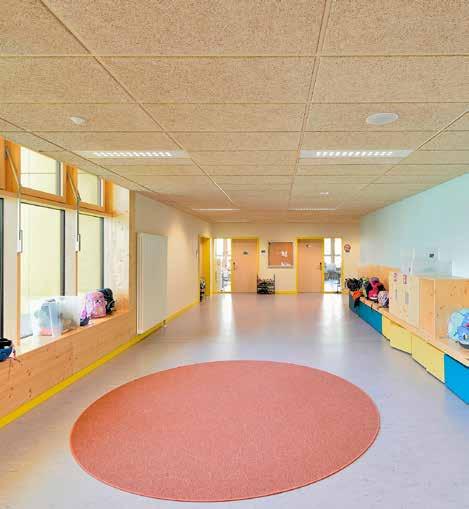 Fensterrahmen aus hellem Holz, farbige Fußböden und teils bunt gestrichene Wände werden mit vorwiegend weißer Möblierung in den Flur- und Aufenthaltsbereichen kombiniert und erzeugen eine entspannte Wohlfühlatmosphäre. Perfekt darauf abgestimmt sind die in den Gruppenräumen verwendeten hellbraunen Akustikplatten, die sowohl in Aufenthaltsräumen als auch im Sanitärbereich Verwendung finden.