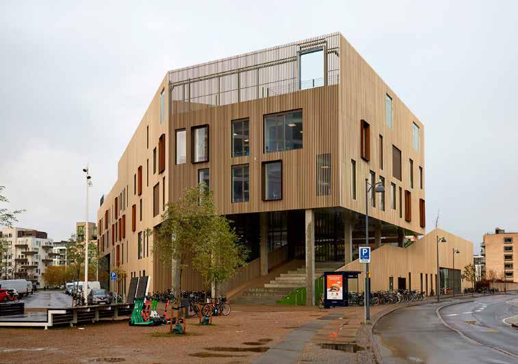 Das neue Schulgebäude mit seinen markanten Fassaden liegt in der Straße Artillerivej. Eine breite Außentreppe wirkt einladend und führt direkt hinauf zur großzügigen Dachlandschaft auf Ebene 4. Ganz oben befindet sich das