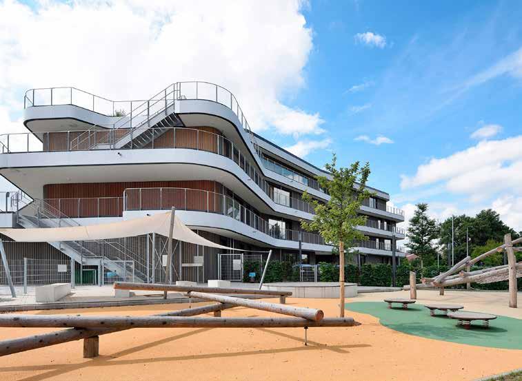 Vom zentralen Mittelbau mit Eingangsbereich, Mehrzweckraum und Essbereich geht eine überdachte Terrasse ab, die den Zugang zu den mehr als 2.000 Quadratmeter großen Außenspielflächen ermöglicht. Die Gruppenräume sowie ein Verwaltungsbereich zweigen vom Mittelbau ab.