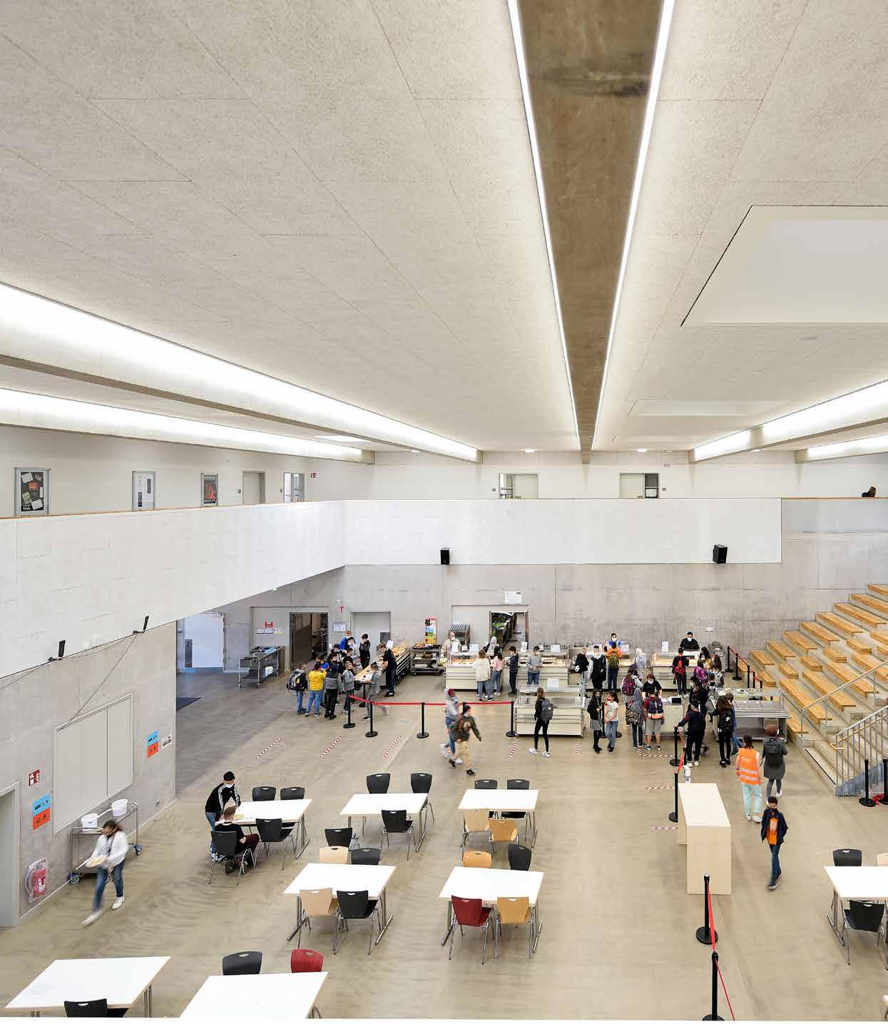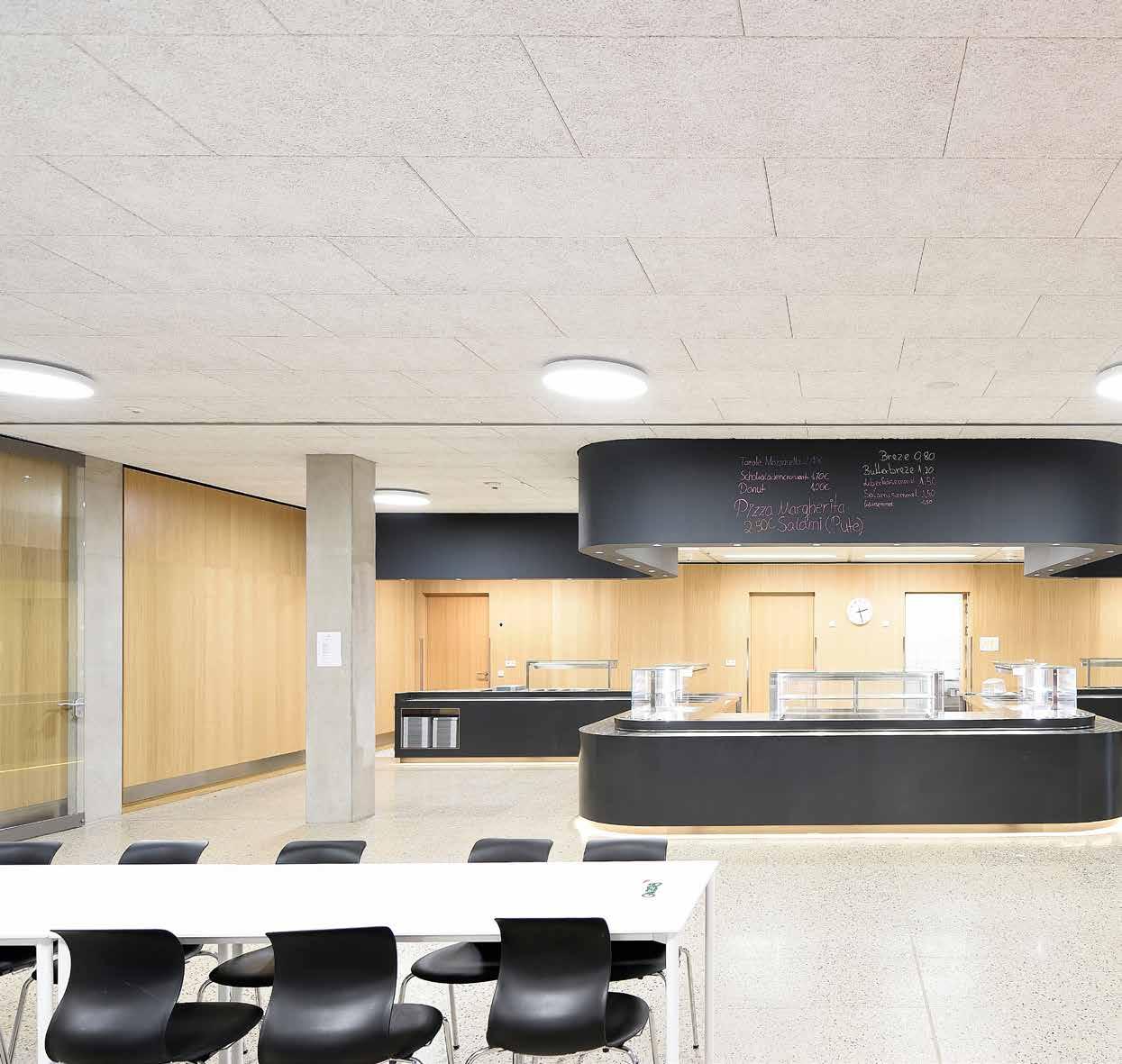 Ebenfalls im Erdgeschoss befindet sich die Mensa mit Ganztagsbereich als kommunikatives Zentrum. Sowohl hier als auch im Foyer sind helle Böden mit hellgrauen Betonwänden im modernen Industrielook sowie mit dunklen Decken kombiniert.