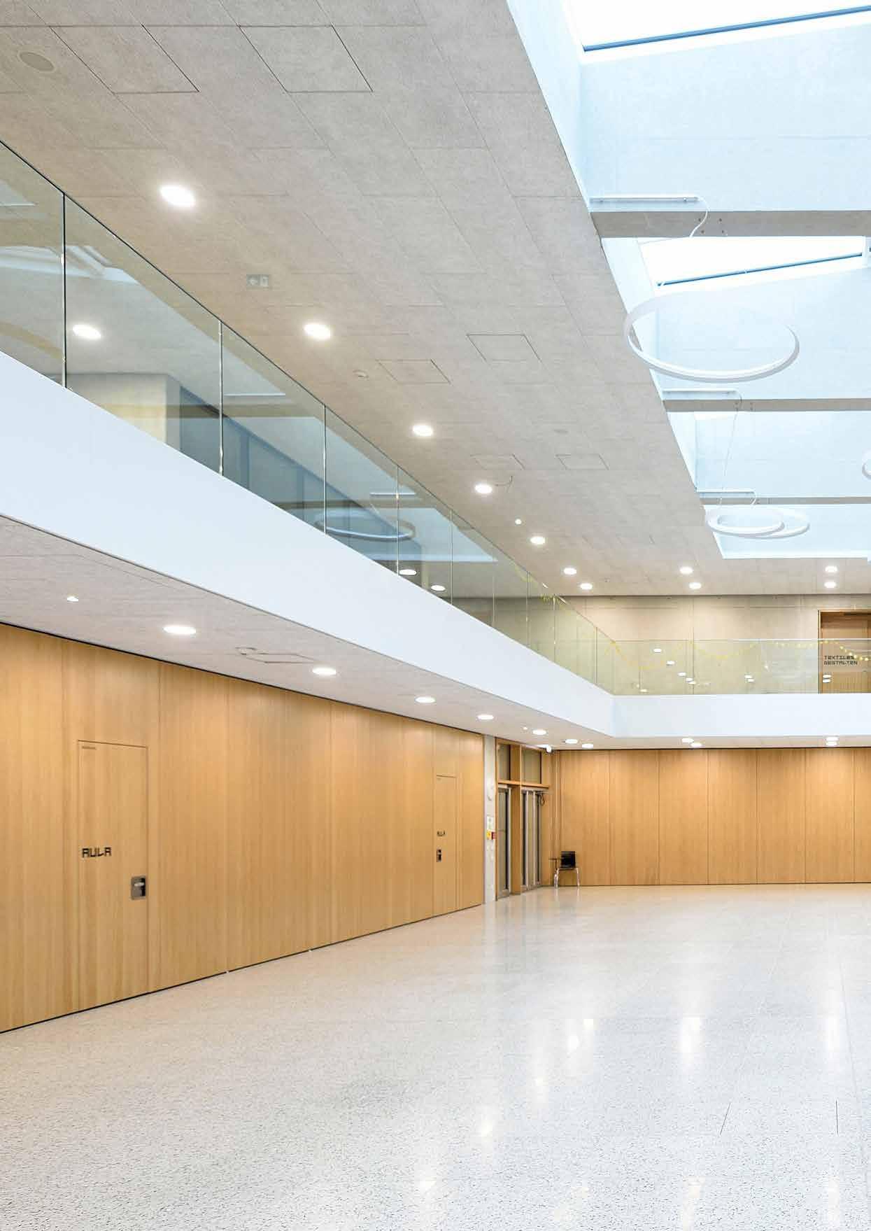 Im oberen Bereich des hellen und offenen Schulneubaus, in dem Glas-, Beton- und Holzelemente dominieren, be -