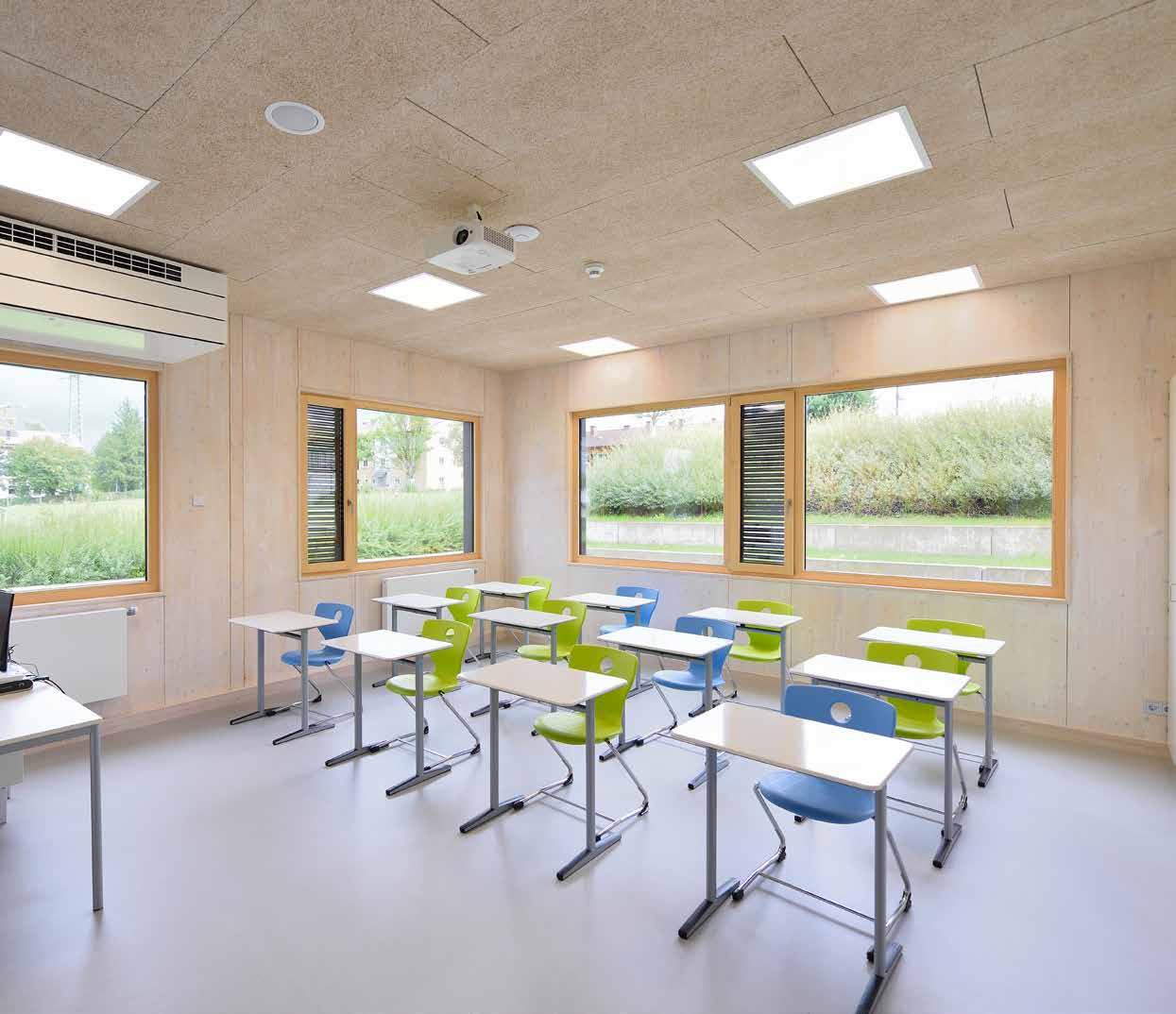 Das Innenraumklima in den Klassenzimmern ist hervorragend. Die Konstruktion ist trotz der guten Isolierung atmungsaktiv und es gibt keine Gasabscheidungen. Auch räumlich bietet der Anbau tolle Qualitäten. Die hohen, schrägen Decken mit Troldtekt-Akustikplatten sorgen neben einer guten Akustik auch für eine fantastische Ruhe im Raum.