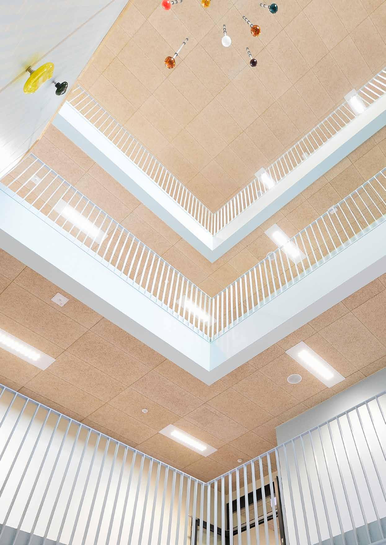 Akustikplatten als Teil des Gesamtkonzeptes Besondere Anforderungen seitens der Bauherren an eine optimierte Akustik in den Klassenräumen und auch in der großzügigen Mensa, setzten die Planer durch den Einsatz von Troldtekt Akustik-Deckenplatten um. Sie sind mit ihrer natürlichen Farbe perfekt abgestimmt auf die warmgelben Fußböden, die farbigen Wände und die vielen Holzelemente.