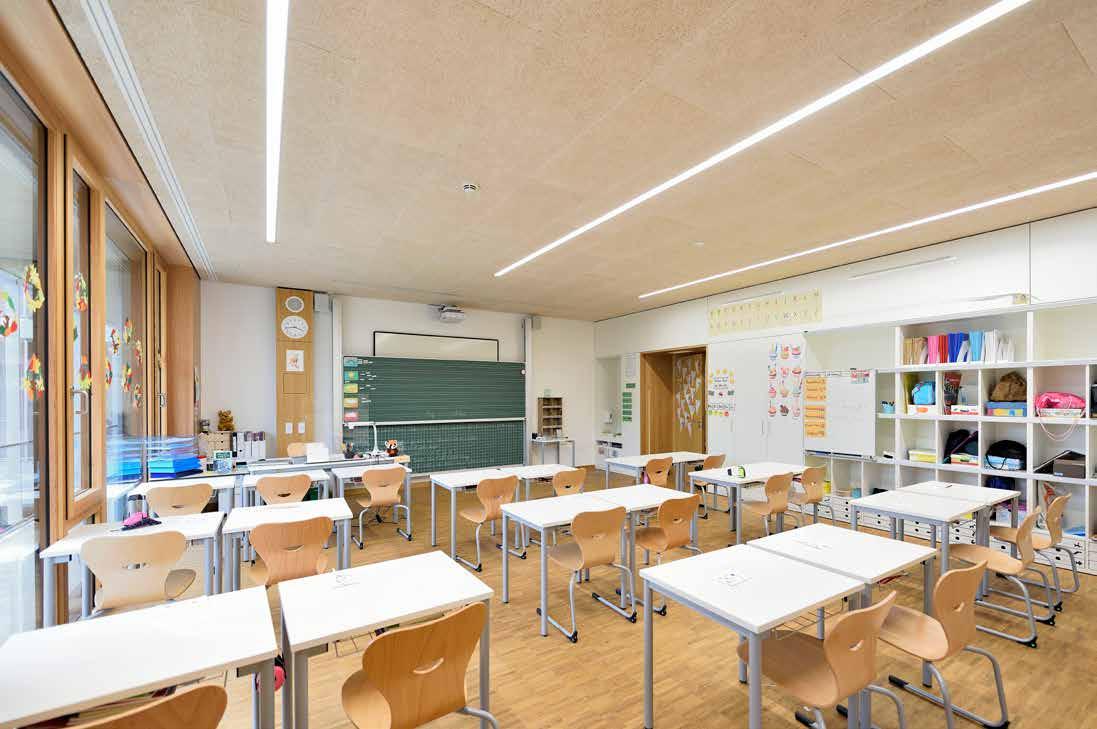 Tür- und Fensterrahmen aus hellem Holz verströmen eine ausgeglichene Wohlfühlatmosphäre und bilden einen warmen Kontrast zu den hellen Wänden. Die einladende und ruhige Stimmung in den Klassen- und Differenzierungsräumen wird durch die eingesetzten Akustik-Deckenplatten in hellem Beige noch verstärkt.