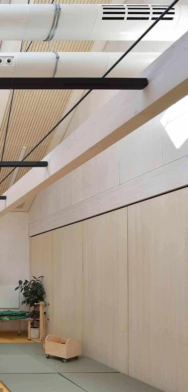 Viel Glas im Inneren des Neubaus schafft ein offenes und transparentes Raumgefühl. Helle Holzrahmen an Fenstern und Glastüren in Kombination mit weißen Wänden und hellbraunen Fußböden tragen zur entspannten Wohlfühlatmosphäre bei. Farbige Akzente werden unter anderem mit Möbeln und Wandbildern in warmen Gelbtönen gesetzt – ganz im Zeichen der Sonnenblume. Gemütlich wirken die hohen Räume auch aufgrund der teilweise schrägen Decken mit den daran sichtbaren Holzbalken, die einen schönen Kontrast zu den weißen Wänden bilden. Genau wie die Troldtekt-Akustikplatten, die zwischen den Dachsparren eingesetzt wurden und die die Aufenthaltsqualität durch ihre akustischen Eigenschaften in der Kita ebenfalls deutlich erhöhen.