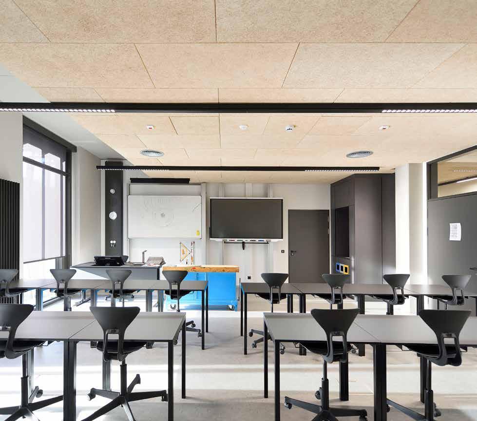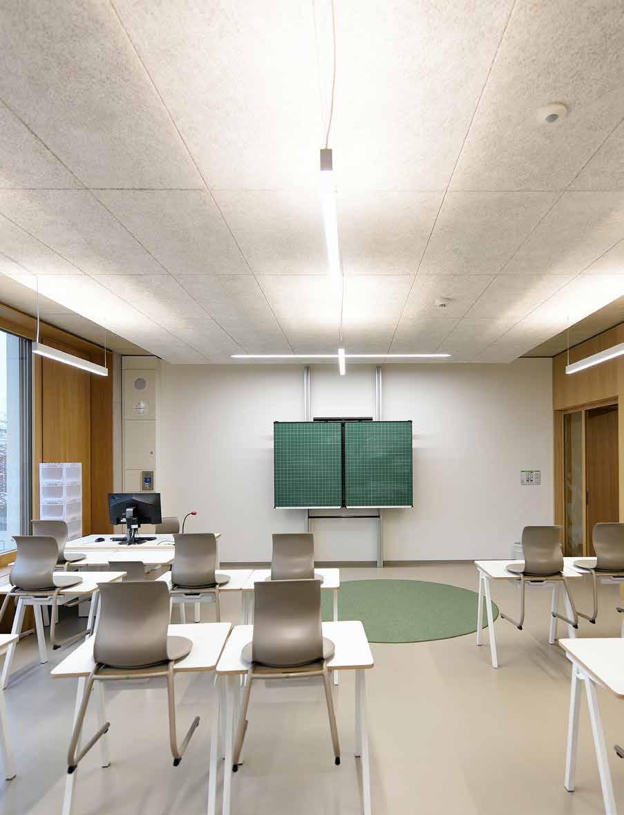 Das Innenraumklima und die Akustik stehen in allen Schulräumen an erster Stelle. Quadratische Troldtekt-Akustikplatten in Natur Hell bilden in der gesamten Schule die homogene Deckenverkleidung. Sie fungieren als dezenter Hintergrund und tragen dazu bei, den sehr unterschiedlichen Räumen eine gemeinsame Identität zu geben.