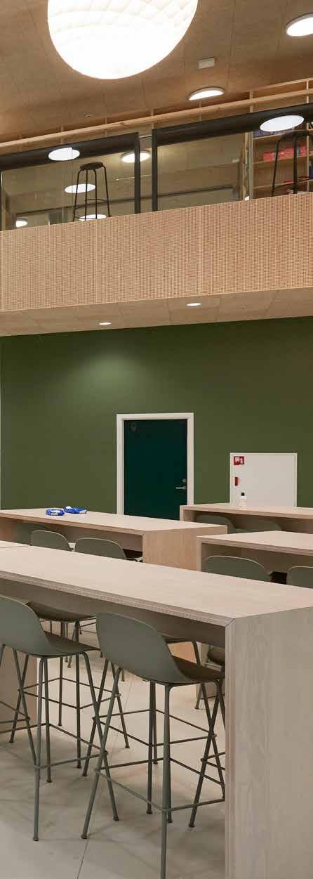 Passend dazu wurden an den Decken zwei verschiedene Variationen von Akustikelementen eingebaut. Neben hellen Troldtekt-Standardplatten kommen auch Elemente mit Linienstruktur zum Einsatz, die optisch an die Holzfassade erinnern und so einen harmonischen Bogen von innen nach außen schlagen sowie das Gesamtkonzept perfekt abrunden.