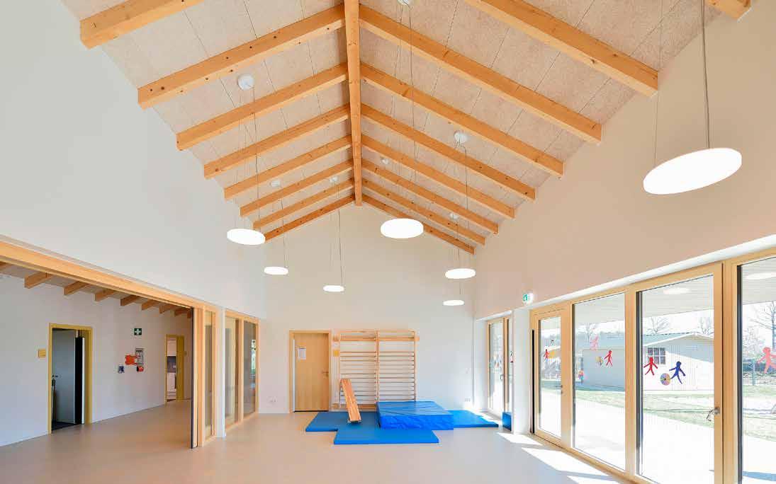 Im Auftrag der katholischen Kirchenstiftung St. Willibald hat das Architekturbüro Berschneider + Berschneider in Möning-Freystadt in der Oberpfalz in Bayern einen eingeschossigen, CO²-neutralen Gebäudekomplex realisiert, der von außen wie von innen in puncto Nachhaltigkeit, Funktionalität und Design überzeugt. Eine energieeffiziente Wärmepumpe in Kombination mit einer Fußbodenheizung sorgt für behagliches Innenraumklima und eine gute energetische Bilanz. Der barrierefreie und komplett ohne Treppen geplante Kindergarten bietet auf einer Gesamtnutzfläche von 686 Quadratmetern Platz für zwei Krippen- und zwei Elementargruppen.