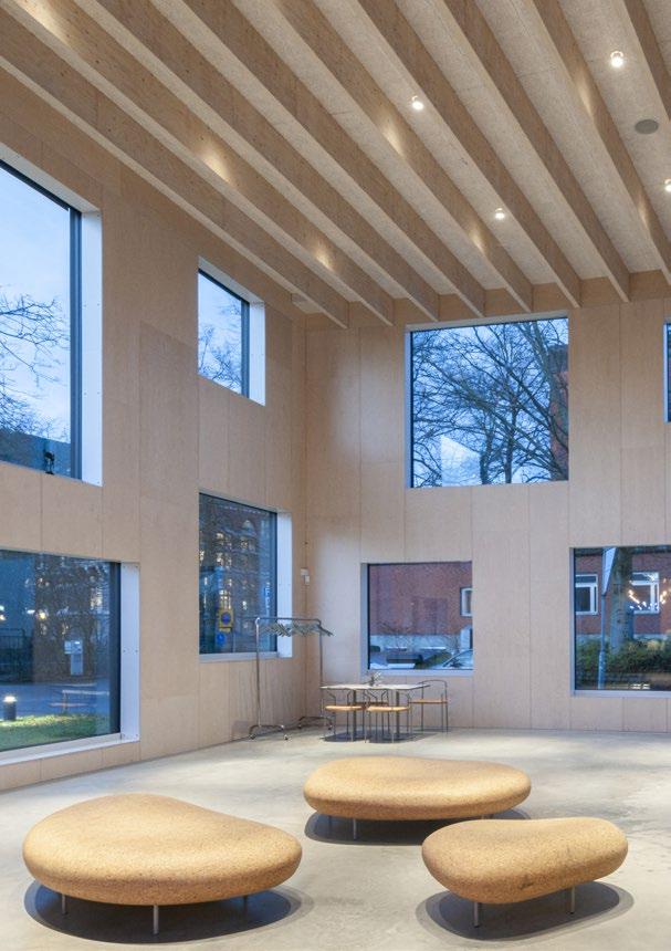tioner och idrottshallar till kontorsbyggnader, restauranger och privata hem. Kombinationen trä och cement ger Troldtekt cementbunden träull dess unika ljudabsorberande egenskaper och förmåga att säkerställa god akustik. Materialet är robust och långlivat, klarar fuktiga miljöer och ger samtidigt ett effektivt brandskydd.