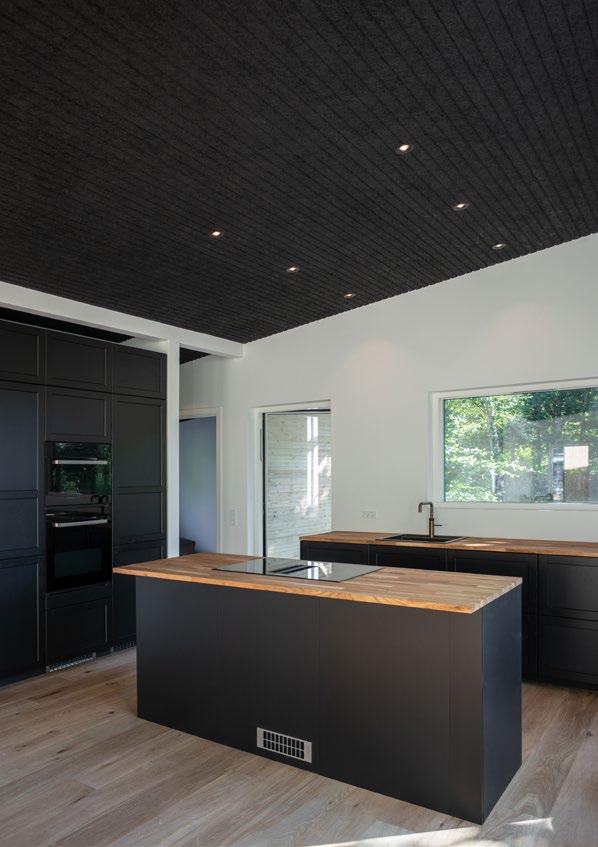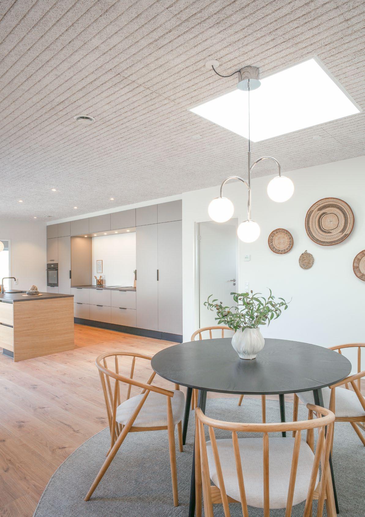 In dem modernen Wohnhaus liegt der Schwerpunkt auf dem Zusammenhang zwischen allen Räumen, damit das Haus als architektonisches Ganzes wahrgenommen wird. Gleichzeitig ist gute Akustik in einem modernen Haus, in dem es nur wenige andere schallabsorbierende Flächen gibt, unerlässlich. Für das Musterhaus wurde die brandneue Troldtekt V-Line 1way 10 gewählt, in diesem Fall in Weiß mit ultrafeiner Textur. Die attraktiven V-Rillen verlaufen als verbindendes Element an den Decken aller Räume. Mit den gefrästen V-Rillen stellt Troldtekt V-Line im Gegensatz zur kontrastreicheren Troldtekt Line eine dezentere Designlösung dar.