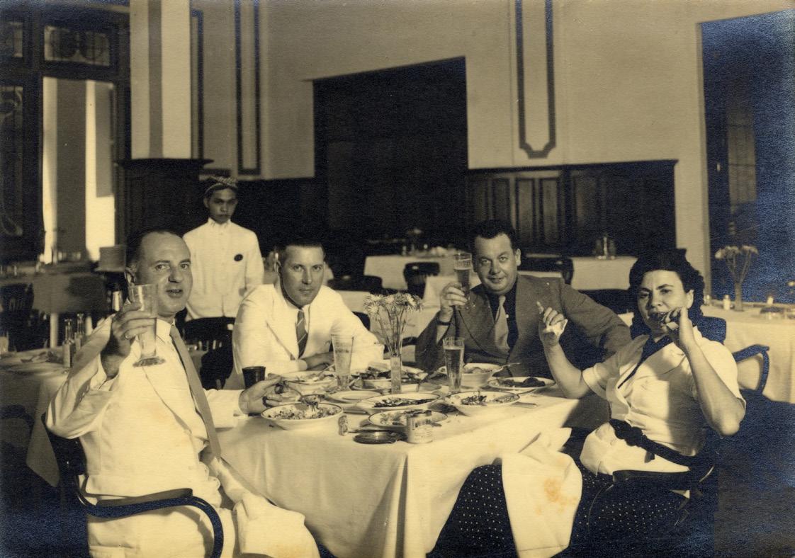 Europeans enjoying a meal in a restaurant, with an Indonesian waiter in the background. Date somewhere between 1930 and 1950, location unknown. Leiden University Libraries, KITLV 826902.