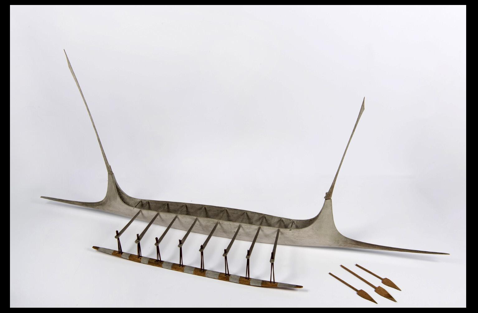 This two-metre long model canoe with paddles represents a nineteenth-century watercraft from the islands of Wuvulu or Aua, situated off the north coast of New Guinea. The shape of the breadfruit tree hull refers to the streamlining of sharks, and the verticals affixed imitate shark fins and tails. White limewash was applied to protect the wood. Large canoes were used for interisland voyaging, while smaller boats were intended for shark fishing. Canoes belonging to chiefs were taken apart upon their passing, and their hulls mounted upright as commemorative grave-markers. 1