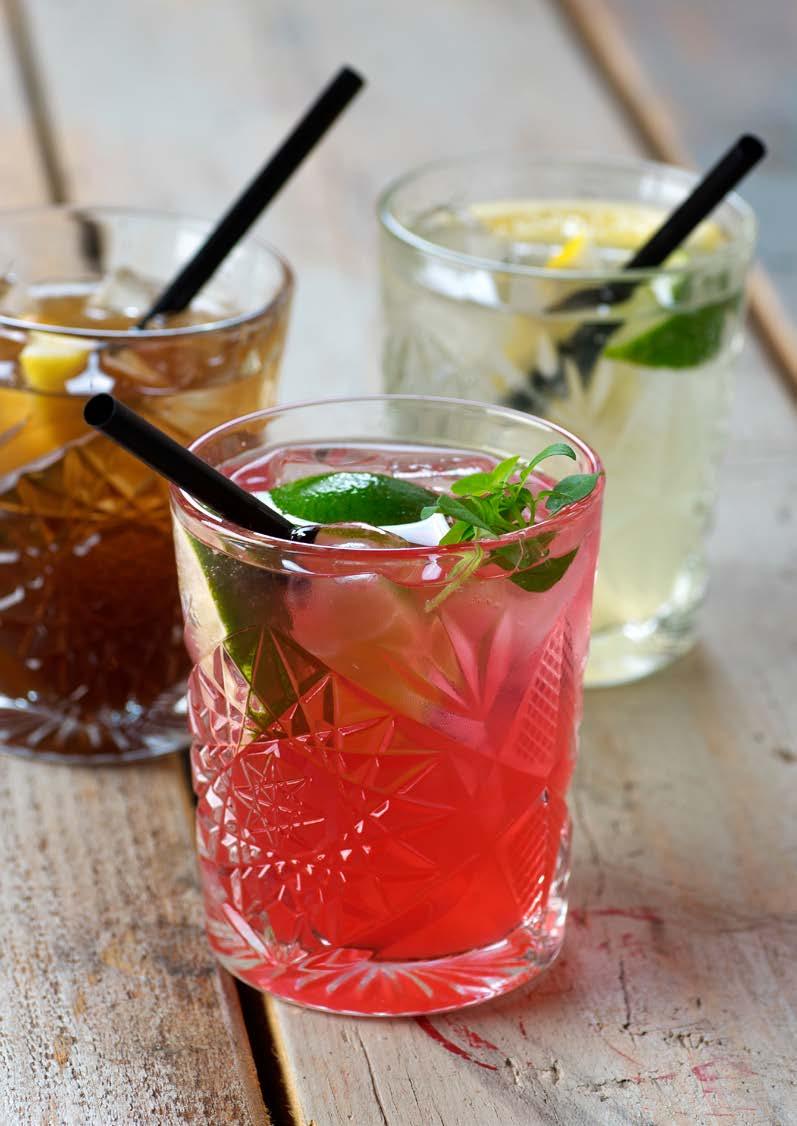 Cocktail bar | professional cocktail shaker | alcoholic and non-alcoholic cocktails in cocktail glasses with ice and garnish | personal menu