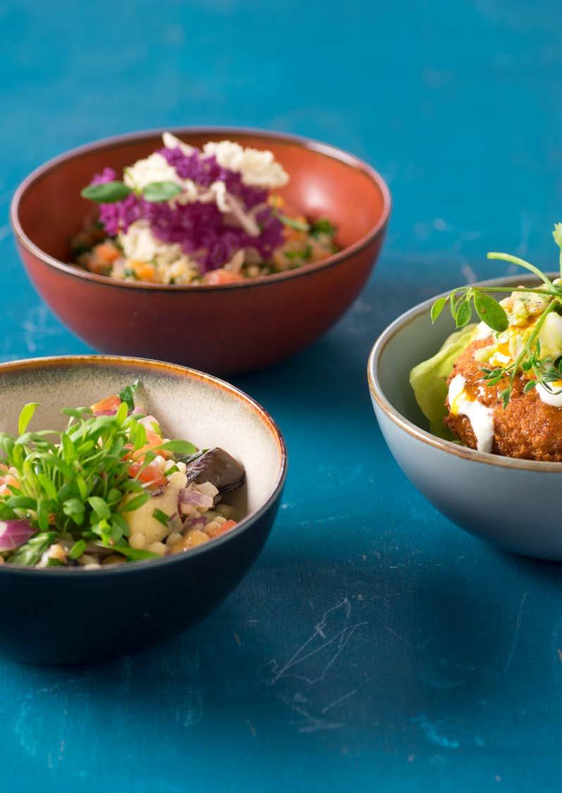 Greek pasta salad with bell pepper, semi-matured Buuren cheese and a herb vinaigrette | Thai green papaya salad with Chinese cabbage and cucumber | Dutch crudités salad with lettuce, baby spinach and Buuren yoghurt dressing