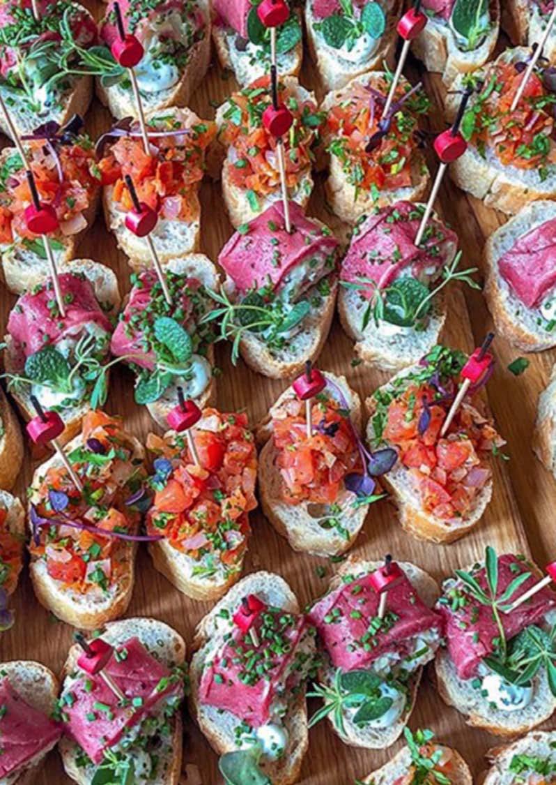 Old Rotterdam cheese with beetroot mustard mayonnaise | baba ganoush with grilled aubergine and pomegranate | Manchego with fig confit and rocket | smoked beef with celeriac and green apple | gravlax with lemon mayonnaise and rocket | mackerel rillette with cucumber and tarragon