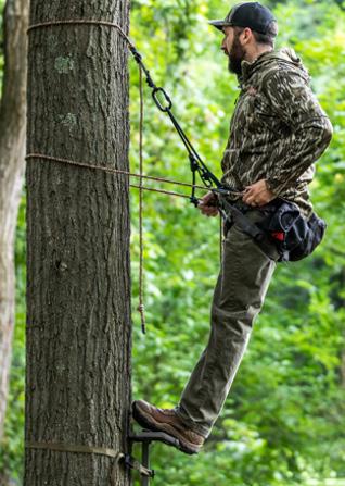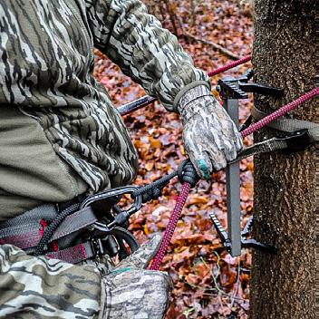 ALWAYS use a fall arrest system (FAS) comprised of a Trophyline Tree Saddle or full body harness that meets the requirements of ASTM F2337 and lineman’s rope when installing or removing Climbing Aids. (climbing sticks, stick ladders, sectional ladders, steps, etc)