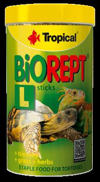 Nejběžnější želvy se kterými se setkává me v teráriích jsou: želva zelenavá (Testudo hermanni), středomořská (Testudo graeca), vroubená (Testudo marginata) a čtyřprstá (Testudo horsfieldii). V dietě zmíněných dru hů dominují složky rostlinného původu –a to hlavně traviny, byliny a květy. Ovoce a zelenina zaujímají rozhodně menší část di ety a proto nelze dietu stavět pouze na nich. Speciálně jsme pro tuto skupinu připravili Biorept L – vícesložkové krmivo ve formě extrudovaných tyčinek pro každodenní kr mení. Správné složení vybraných přírodních surovin rostlinného původu pokrývá nutrič ní požadavky býložravých želv. Jeho složení je založeno na travinách, včetně na bojínku lučním, což dělá jídlo velmi chutným. Přída vek pampelišky, jitrocele a květů měsíčku lékařského, poskytuje cenné živiny a atrak tivní vůni. Díky vynikající chuti tyčinek je zví řata dychtivě konzumují. Snížená hladina bílkovin se zvýšeným obsahem krmné vlákniny zaručuje zdravý a vyvážený růst měkkých tkání ve vztahu