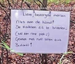 Van Maria van Tilborg ontving de redactie een foto (eigenlijk bestemd voor Lezerspost) over diezelfde kalkoen. "Ik was pas aan het wandelen en zag een briefje aan het schrikdraad hangen. Een kalkoen die aan het broeden was, met de vraag deze met rust te laten. Hoe mooi is dat."