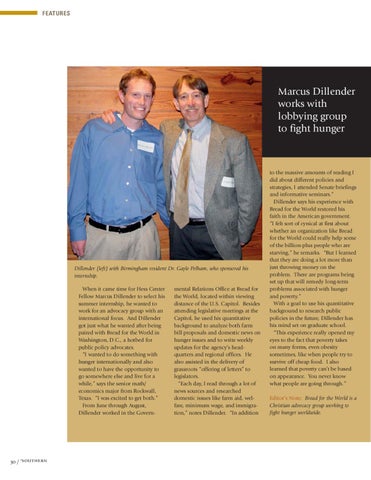 to the massive amounts of reading I did about different policies and strategies, I attended Senate briefings and informative seminars.” Dillender says his experience with Bread for the World restored his faith in the American government. “I felt sort of cynical at first about whether an organization like Bread for the World could really help some of the billion-plus people who are starving,” he remarks. “But I learned that they are doing a lot more than just throwing money on the problem. There are programs being set up that will remedy long-term problems associated with hunger and poverty.” With a goal to use his quantitative background to research public policies in the future, Dillender has his mind set on graduate school. “This experience really opened my eyes to the fact that poverty takes on many forms, even obesity sometimes, like when people try to survive off cheap food. I also learned that poverty can’t be based on appearance. You never know what people are going through.” Editor’s Note: Bread for the World is a Christian advocacy group working to fight hunger worldwide.