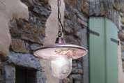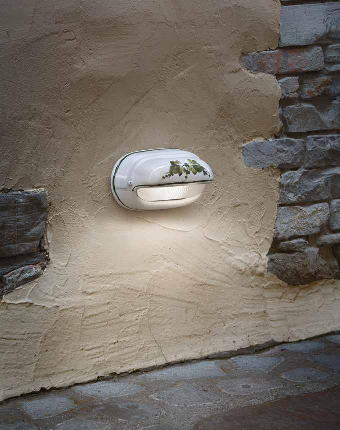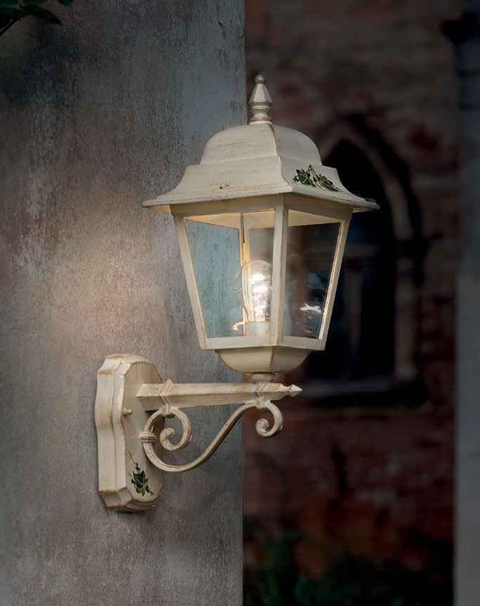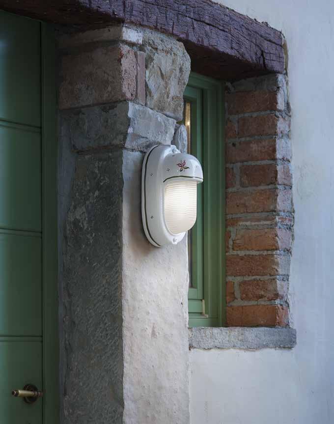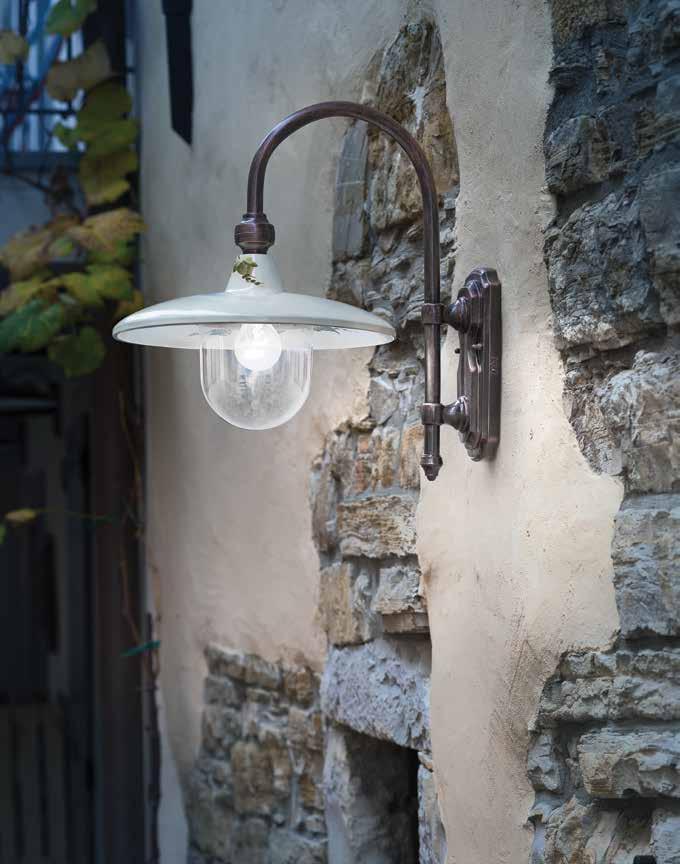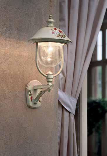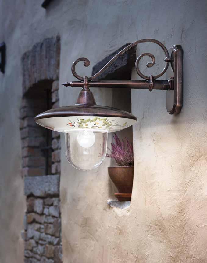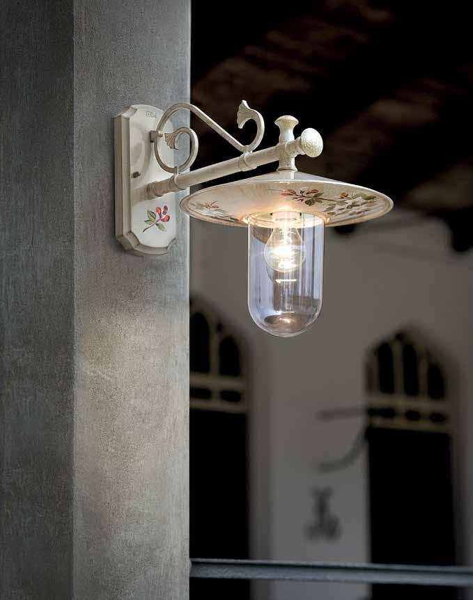 Black metal with a copper gradient characterizes the line dedicated to outdoor lighting. It is made up by appliques and lanterns where the hand-painted foral decors and the rounded edges refne their shapes. For those who want to rediscover the warmth of the small town of the Italian countryside.