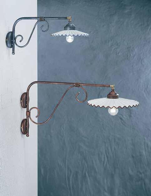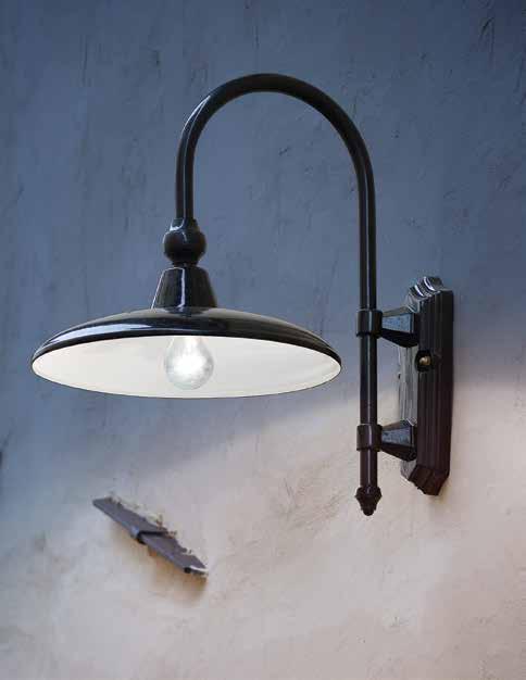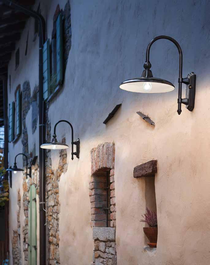 Metallo nero sfumato rame per la linea di lampade per esterni che si compone di applique e lampioncini dove i decori oreali dipinti a mano e la bombatura ingentiliscono le forme. Per chi vuole ritrovare il calore del piccolo borgo tipico della campagna italiana.