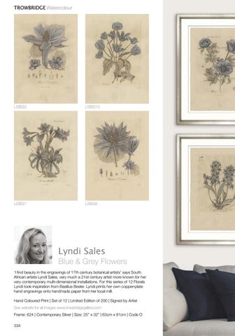 Blue & Grey Flowers ‘I find beauty in the engravings of 17th century botanical artists’ says South African artists Lyndi Sales, very much a 21st century artist more known for her very contemporary multi-dimensional installations. For this series of 12 Florals Lyndi took inspiration from Basilius Besler. Lyndi prints her own copper-plate hand engravings onto handmade paper from her local mill. Hand Coloured Print | Set of 12 | Limited Edition of 200 | Signed by Artist See website for all images www.trowbridgegallery.com Frame: 624 | Contemporary Silver | Size: 25” x 32” | 63cm x 81cm | Code O 334 To Order: US: (1) 404 816 8612