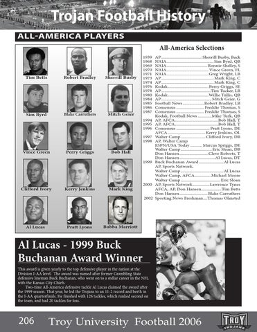 Al Lucas - 1999 Buck Buchanan Award Winner This award is given yearly to the top defensive player in the nation at the Division I-AA level. The award was named after former Grambling State defensive lineman Buck Buchanan, who went on to a stellar career in the NFL with the Kansas City Chiefs. Two-time All-America defensive tackle Al Lucas claimed the award after the 1999 season. That year, he led the Trojans to an 11-2 record and berth in the I-AA quarterfinals. He finished with 126 tackles, which ranked second on the team, and had 20 tackles for loss.