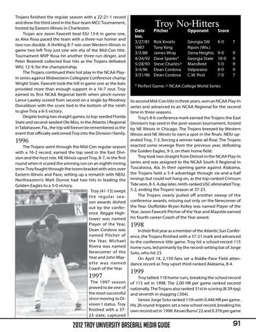 Troy Baseball History Trojans finished the regular season with a 22-21-1 record and drew the third seed in the four-team MCC Tournament, hosted by Eastern Illinois in Charleston. Trojan ace Jason Fawcett beat EIU 13-6 in game one, as Alex Rosa paced the team with a three-run homer and two-run double. A thrilling 8-7 win over Western Illinois in game two left Troy just one win shy of the Mid-Con title. Tournament MVP Rosa hit another three-run dinger, and Peter Bezeredi collected four hits as the Trojans defeated WIU, 12-9, for the championship. The Trojans continued their hot play in the NCAA PlayIn series against Midwestern Collegiate Conference champ Wright State. Fawcett took the hill in game one as the bats provided more than enough support in a 16-7 rout. Troy earned its first NCAA Regional berth when pinch-runner Lance Lawley scored from second on a single by Rhodney Donaldson with the score tied in the bottom of the ninth to give Troy a 6-5 victory. Despite losing two straight games, to top-seeded Florida State and second-seeded Ole Miss, in the Atlantic I Regional in Tallahassee, Fla., the trip will forever be remembered as the event that officially welcomed Troy into the Division I family.